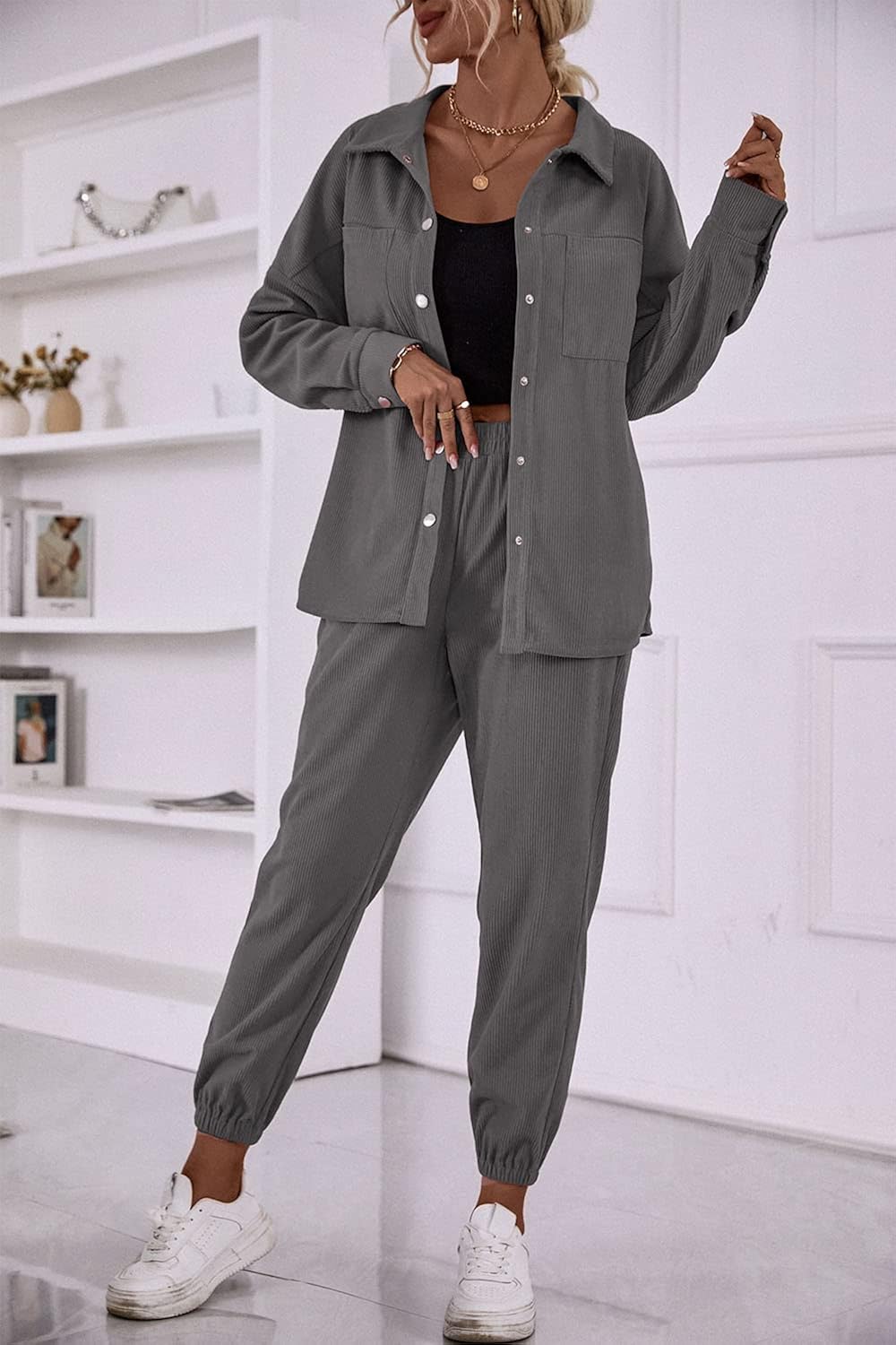 CASUAL TRACKSUIT SETS FOR WOMEN! The Long Sleeve Top Features A Collar, Bust Pocket And Front Button Down Closure, Elastic Wait Design Is Suitable For Any Body Shape. Two Piece Corduroy Tracksuit Set Keeps You Warm And Comfy All Day Long. It's Perfect For Lounge Wear, Running Errands, Going Outside, Hanging Out, Streetwear, Running, Jogging, Walking Any Indoor And Outdoor Activities COLOR OPTIONS: Black Long Pants Sweat Sets/ Brown Two Piece Outfits/ Green Comfy Loungewear Sets/ Grey Womens Tracksuit/ Navy Jogging Outfits For Women/ Pink Travel Outfits/ Red Brown Casual Outfits For Women/ Wine Red Tracksuit For Women Show more