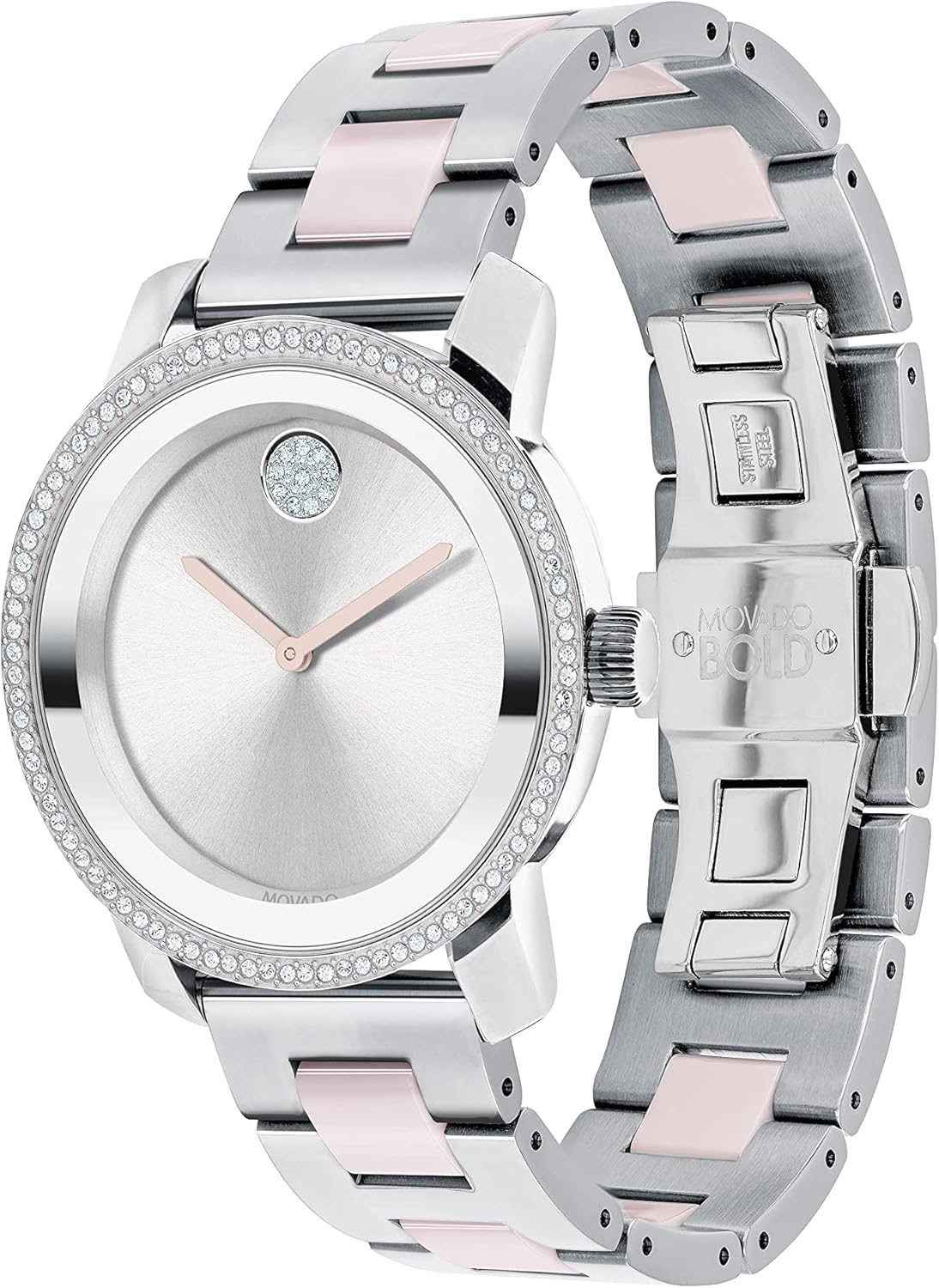 COMPOSURE AND STYLE: Movado BOLD innovation meets modern design, time with a new attitude. RESILIENT DESIGN: Movado BOLD Ceramic, 36mm stainless steel case and bracelet with blush ceramic centerlinks and a silver-toned dial with a crystal pave dot and a crystal-set bezel. REFINED SWISS ENGINEERING: Quartz movement provides precise timekeeping and minimal maintenance for a reliable and worry-free timepiece. EXCLUSIVE STYLING IN K1 CRYSTAL: K1 mineral crystal is the most common crystal used in designer watches and more scratch-resistant than regular mineral crystal. It's even more shatter-resistant than sapphire crystal. CARING FOR YOUR TIMEPIECE: Like any finely crafted mechanism, your Movado watch requires periodic maintenance to ensure optimal performance. A maintenance interval of 3 to 5 years is recommended, in addition to any required battery replacement. Never open the watch yourself.