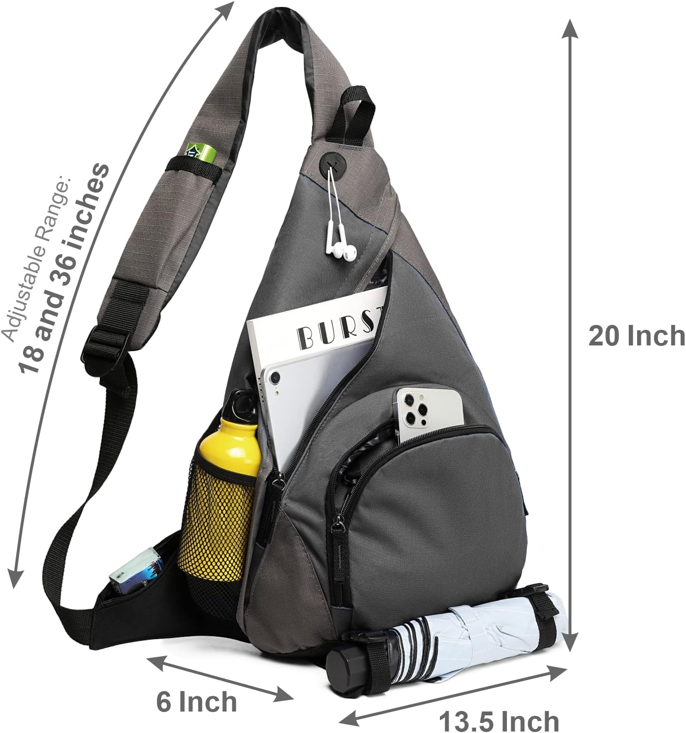 Large Capacity & Multi Compartments - With the size of 13.5 x 6 x 20 Inches (LxWxH), this sling backpack has plenty of extra pockets to keep all your essentials safe and organized, including a large main compartment for your iPad, magazine, key rack, card pouch, wallet pouch, notebook pouch, and 2 pen pouches Adjustable Shoulder Strap - The shoulder strap can be adjusted to reach between 18 and 36 inches, which allows you to wear the shoulder bag in 3 ways. You can carry this bag either on shoulder or across your chest Hidden Earphone Hole - With a hidden earphone hole on the front, it is convenient for you to enjoy music anytime and anywhere. The sling backpack for men and women also has two bottom adjustable compression straps to hold extra layers or gear Durable and Soft Material - Made of durable and soft 600D polyester material with upgraded smooth zippers and strap clip, this sling bag for men and women is not easy to be scratched and comfortable to wear. Water-resistant material prevents the sling backpack getting wet easily during rainy days Multi-functional Crossbody Bag - The sling bag for men crossbody is perfect for school, hiking, sports, commuting. It is lightweight to carry for long journeys or daily activities
