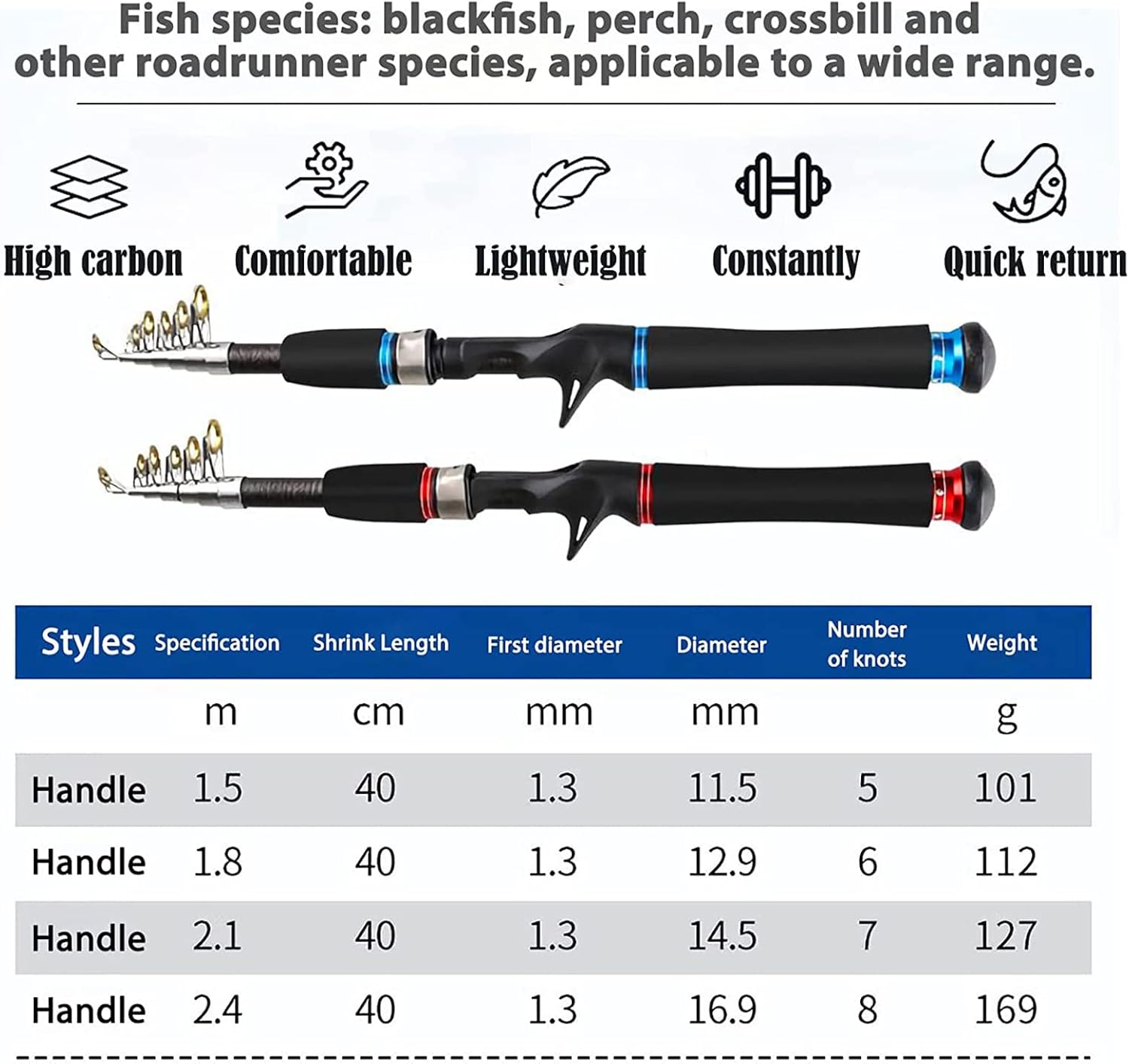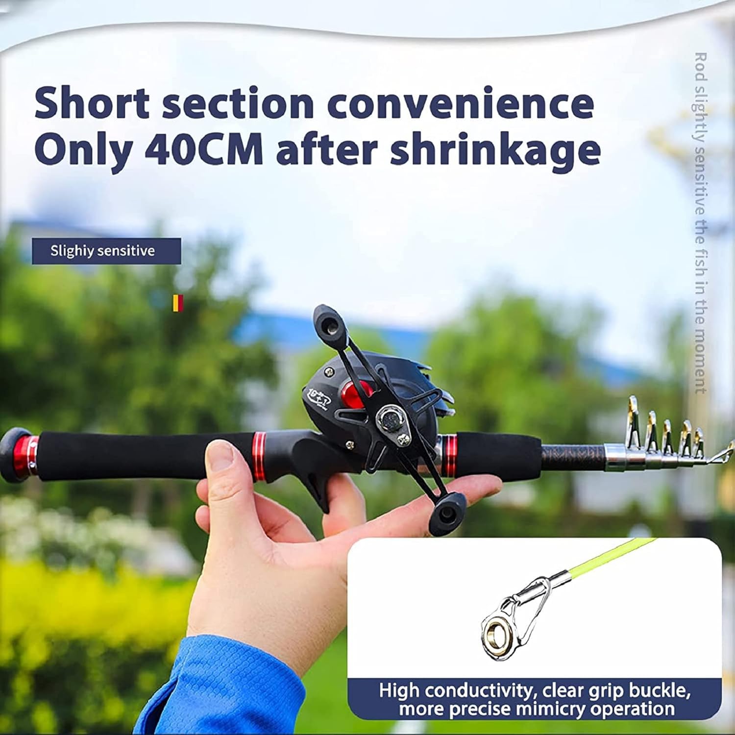 【LIGHTWEIGHT & SENSITIVE】Fishing Rods is constructed from lightweight 24 ton carbon fiber to give you an extremely sensitive blank.It's light weighted yet providing great power, strength, durability and sensitivity. 【40CM TELESCOPIC MINI SHORT POLE】Mini short section is portable, shrink length is only 40cm, easy to pack, fit into pocket, easy to carry; comfortable grip, comfortable and resistant to friction. 【MULTIPURPOSE】This travel fishing rod is actions in travel spinning rod and casting rod models. You’ll find the perfect spinning fishing rod or baitcasting rod for almost any fresh or saltwater fishing situation whether your trout fishing, bass fishing, kayak fishing or even as a n inshore fishing rod for saltwater fishing from the bank or boat. Travel rods feature amazing design and perfect balance. 【SUPERIOR QUALITY】Only high-quality components including stainless steel line guides, graphite reel seats and comfortable EVA handles are used in the construction of the new and improved, telescopic rods. The entire series of spinning rods and casting fishing rods makes a great travel fishing pole or back-up telescopic fishing pole. 【WORRY-FREE AFTER-SALES SERVICE】What you can get from our products is not only the best cost-effective fishing gear but also the customer service which makes you most at ease. All of the products come with a one-year warranty and a best-in-class customer service team.