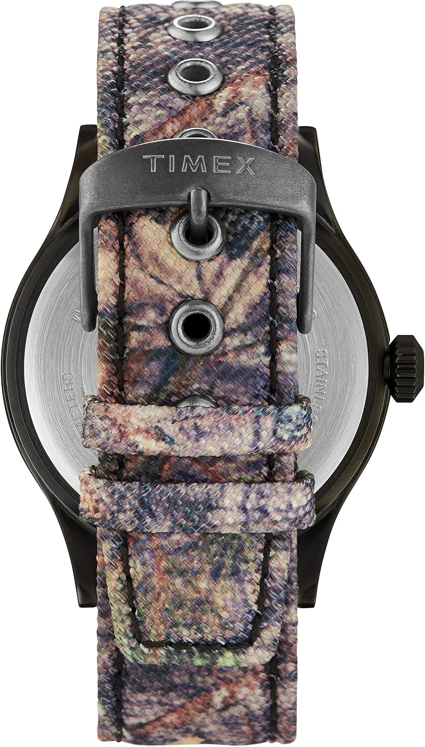 Adjustable 20mm fabric & leather strap fits up to 8-inch wrist circumference; quick-release spring bars Strap features Mossy Oak Obsession camouflage print Dark green dial with date window at 3 o'clock; full Arabic numerals Black 40mm brass case with mineral glass crystal; Indiglo light-up watch dial Water resistant to 50 m (165 ft): In general, suitable for short periods of recreational swimming, but not diving or snorkeling