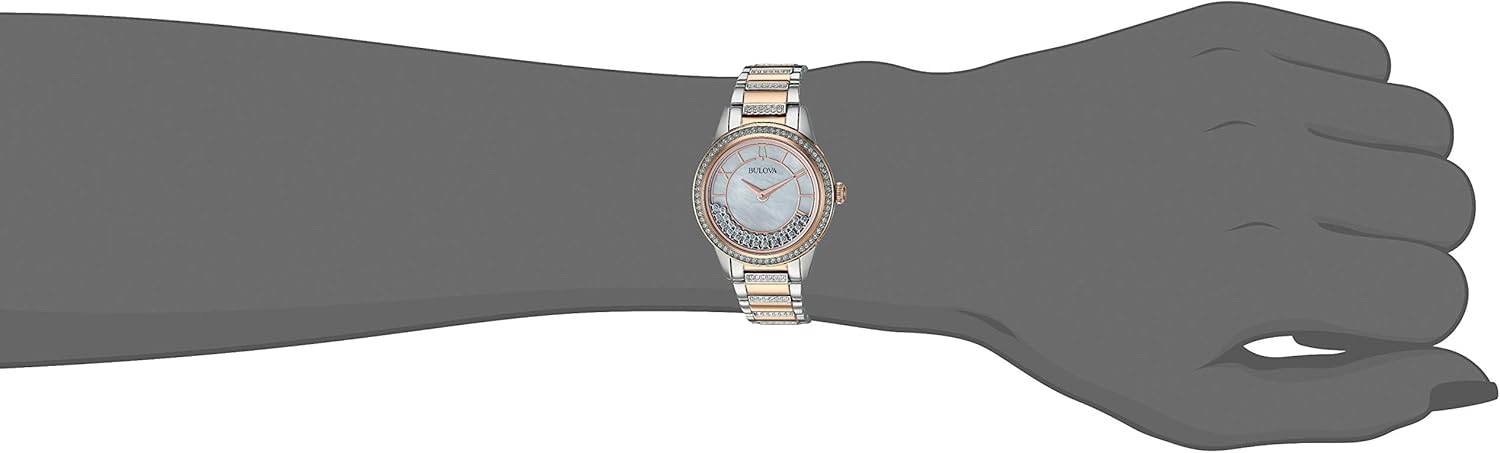 From the Crystal Collection. In stainless steel with rose gold-tone accents and embellished with 139 crystals on bracelet, bezel and floating on white mother-of-pearl dial, domed mineral glass, rose gold-tone accented stainless steel bracelet with deployment closure, and water resistance to 30 meters. 2 Hand Two-Tone Stainless Steel 139 Crystals and Domed Mineral Crystal 30M Water Resistant and 3 Year Limited Warranty