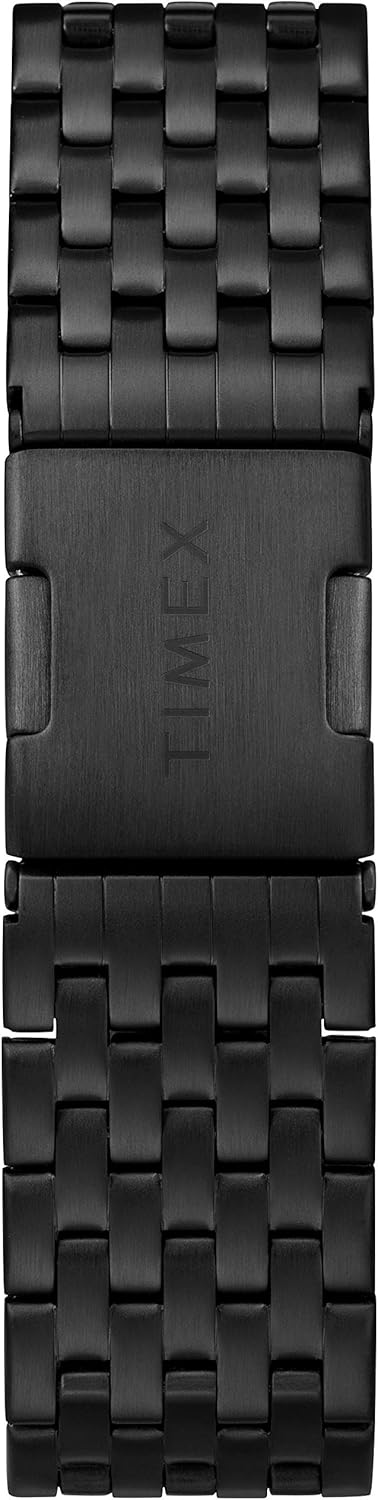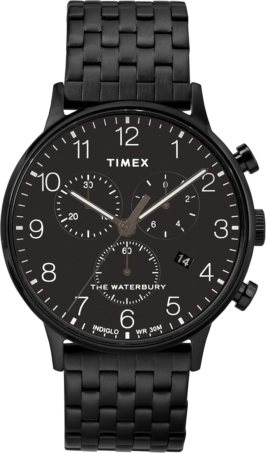 Adjustable black 20mm stainless steel bracelet fits up to 8-inch wrist circumference Black dial with date window at 4 o'clock; Arabic numerals 30-minute chronograph measures to 1/20th second Black 40mm stainless steel case with mineral glass crystal; Indiglo light-up dial Water resistant to 50m (165 ft): In general, suitable for short periods of recreational swimming, but not diving or snorkeling