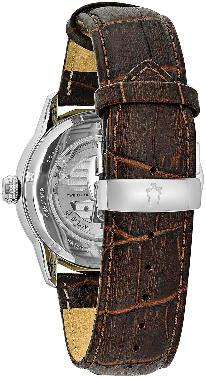 Imported Due to a recent redesign by Bulova, recently manufactured Bulova watches, including all watches sold and shipped by Amazon, will not feature the Bulova tuning fork logo on the watch face. Brown patterned and rose gold dial Leather strap, Slightly domed mineral crystal Water resistant to 99 feet (30 M): withstands rain and splashes of water, but not showering or submersion Case Diameter: 42 mm ; Case Thickness: 11.2 mm ; 3-year Limited Warranty