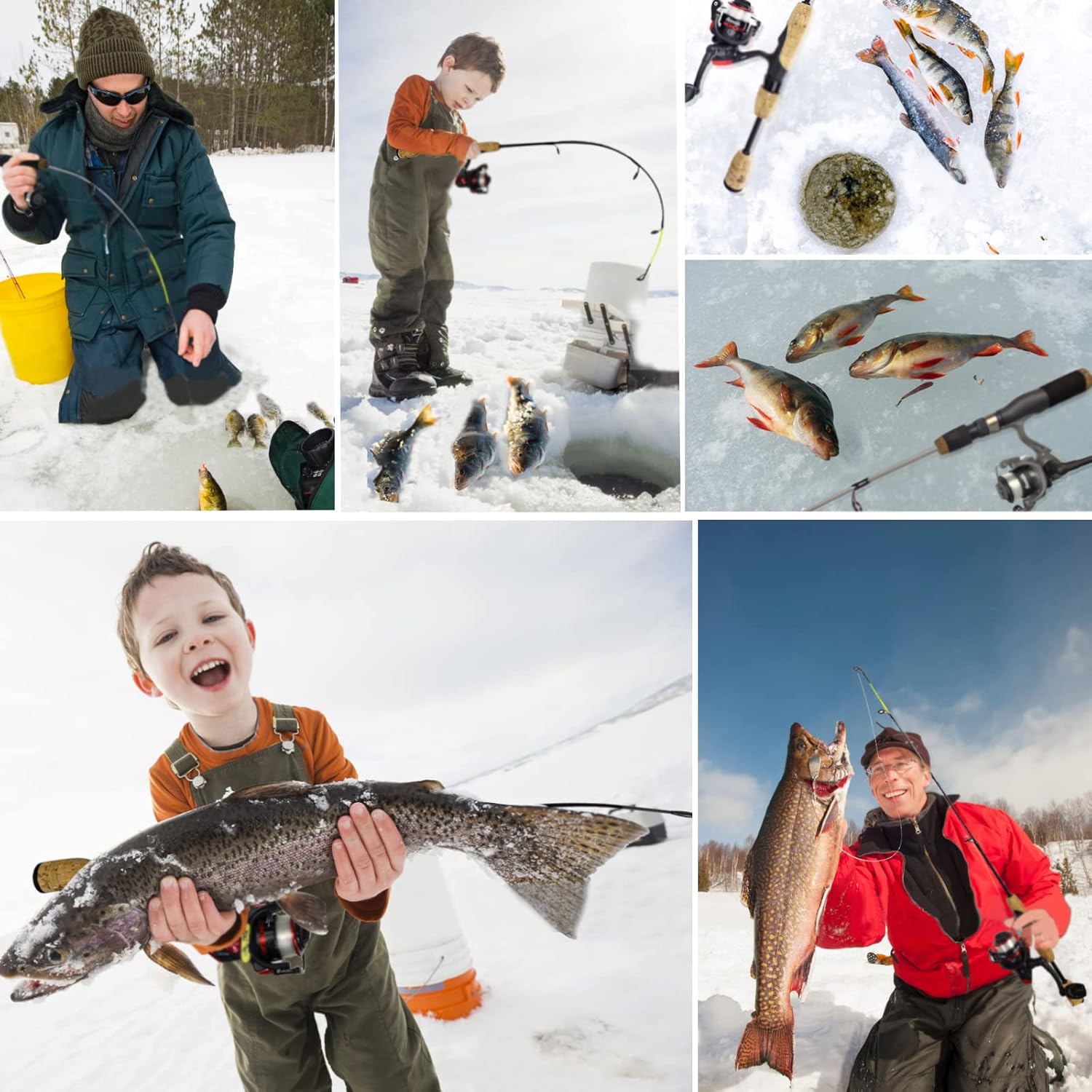 About this item EXPERIENCED ICE FISHING KIT: The full kit includes: Aurora ice fishing rod x1, AW-300 ice fishing reel x1, Ice fishing line x1, Various fishing lure baits and owner’s manual x1. Which can meet most of the needs of a beginner and realize one-stop purchase. Make you meet your best ice fishing experience this winter. Different tonality to meet the different needs of fishing, panfish, perch, walleyes and trout, pikes and bass. AURORA ICE FISHING ROD: This ice rod using a combination of high-tech construction with graphite and fiberglass, more sensitive and strong, a cork split-grip handle with sturdy plastic reel seat is easy to assemble and disassemble. Stainless steel guides with Ceramic inserts provide durability and eliminate insert pop-outs. Guides with bigger eyes make it easy to pass the line and are less prone to ice accumulation. AW-300 ICE FISHING REEL: This ice reel with 3+1 shielded stainless-steel ball bearings, reinforced graphite body and CNC Aluminum spool with graphite knob handle. Smooth Easy Line Through High Feet Design allows you to fish with gloves on and keep your hands warm without hitting them on the rotor. ICE FISHING LURE&LINE: Except the pre-loaded Ice reel with line, We also have a backup ice fishing line. Mono fishing line is generally superior to braid and fluoro in terms of knot strength. It can provide you with enough support while you fight with fish.There are 5 shapes of jig heads and 2 shapes of soft lures, and each shape comes in many different colors. These are the best colors to attract fish, all distinctively designed. EASY TRAVEL&STORAGE: All rods come in 2 pieces for super easy storage and travel. This makes taking a Aurora ice rod with you simple and easy even if you’re riding a bike, backpacking, taking a motorcycle trip or just need to keep extra fishing rods in your car or boat. It's the best gift to send father, son, husband, fiancé, boyfriend for the upcoming Christmas.