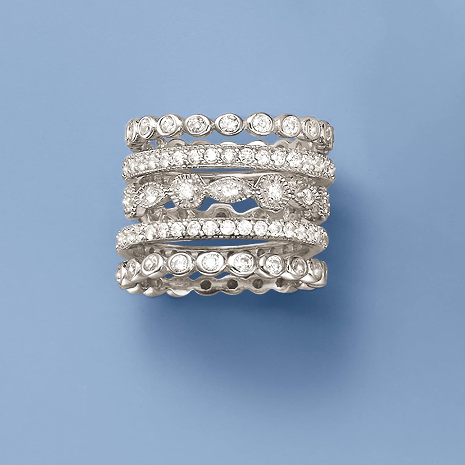 STERLING SILVER AND CZ — 2.50 ct. t.w. CZ jewelry set. Five eternity bands in sterling silver. Polished finish. 1/2 in. wide. Size 5. IDEAL FOR EVERYDAY WEAR — With its essential design, this CZ jewelry set of eternity bands wears well whether you’re running errands, in the office or out with the girls. ROSS-SIMONS QUALITY — Treat yourself to the luxury of Ross-Simons fine jewelry. Whether your selection is made of 14kt gold, 18kt gold or gorgeous sterling silver, our jewelry always makes a lasting statement. THE PERFECT GIFT FOR HER – This is the ideal gift for your sister, daughter, mom, wife, niece, aunt, best friend, girlfriend (or yourself!). Whether she prefers modern or traditional jewelry, Ross-Simons has a wide selection of bracelets, earrings, necklaces and rings to choose from. GIFT BOX INCLUDED – Ross-Simons jewelry arrives beautifully packaged in a gift box, ready to delight for any occasion, including birthdays, Christmas, Mother’s Day, anniversaries, Valentine’s Day, weddings, graduations and much more!