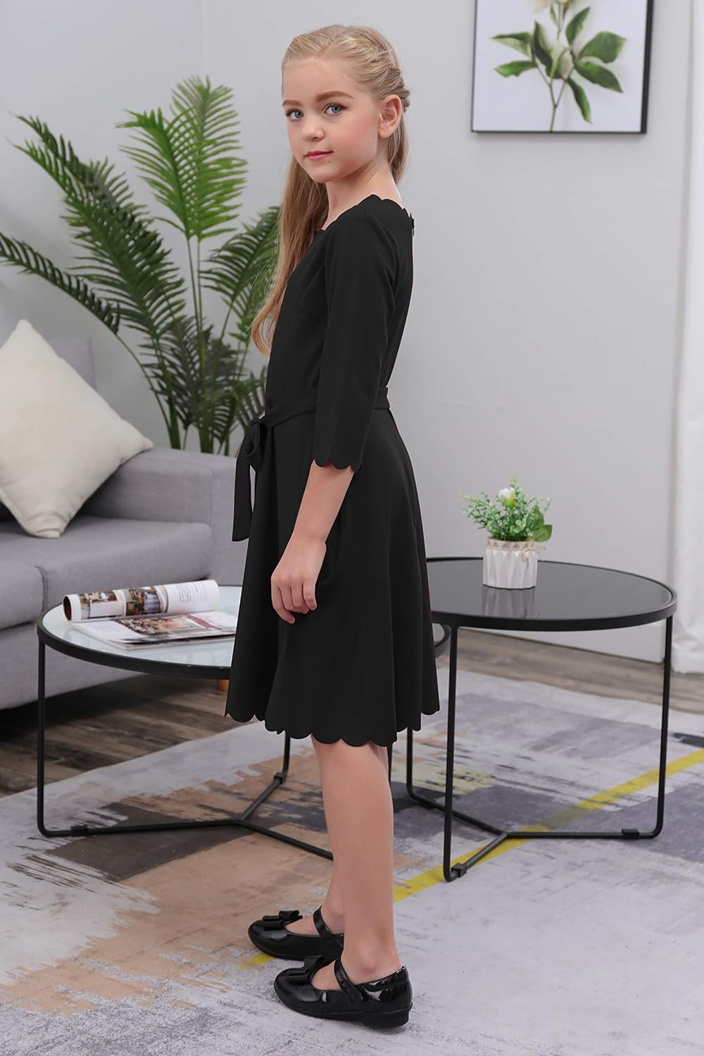 100% Polyester     Imported     Zipper closure     Hand Wash Only     100 Percent Polyester, elastic and comfortable fabric without pilling. Well made as far as fabric and stitching.     Features: Stylish and Unique Casual Style; Neckline, Cuffs and Hem Edges are Scalloped; Round Neck, 3/4 Sleeve, Fit and Flare Silhouette, Back Zipper, Two Side Pockets, Knee Length, No lined. And one removable Delicate Waistband that can be used to tie a bow.     The best choice for Party Occasion, Casual Outdoor, Birthday, Dinner, Wedding, Banquet, Trip, Tea, Church, Sunday Vacation, Daily Wear, etc. Available in age: For 4-14 Years Children.