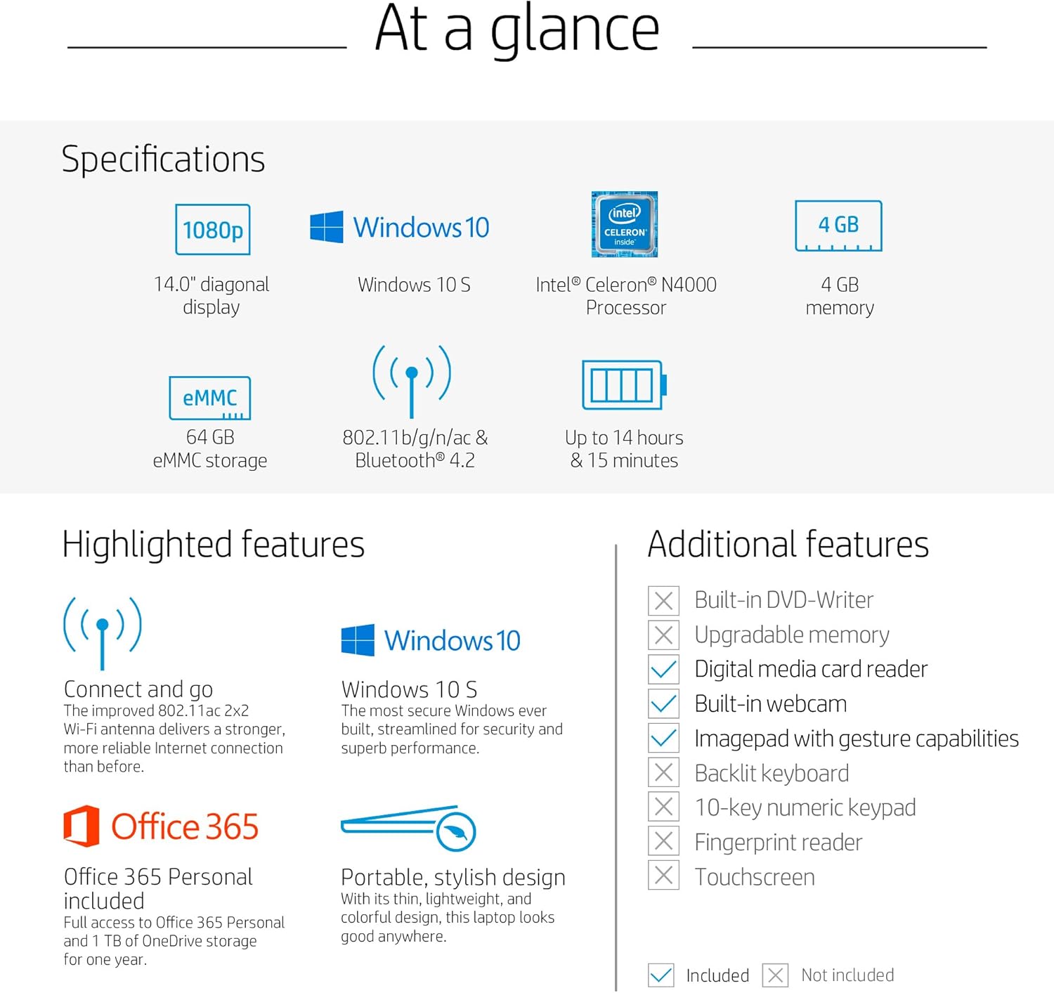 Office 365 personal for one year: get full access to Microsoft Excel, Word, PowerPoint, OneNote, access, and 1 TB of OneDrive storage for one year. Processor: intel(r) celeron(r) N4000 Processor, dual-core, 1.1GHz up to 2.6GHz. Display: 14.0-Inch diagonal Full HD IPS bright View WLED-backlit Display (1920 x 1080). Memory: 4 GB DDR4-2400 SDRAM (not upgradable). Storage: 64 GB eMMC. Battery life: up to 14 hours and 15 minutes (video playback); up to 11 hours and 30 minutes (wireless streaming). Dimensions AND weight (unpackaged): 13.27 inches (W) x 8.90 inches (D) x 0.70 inch (H); 3.17 pounds. Operating System: Windows 10 S.