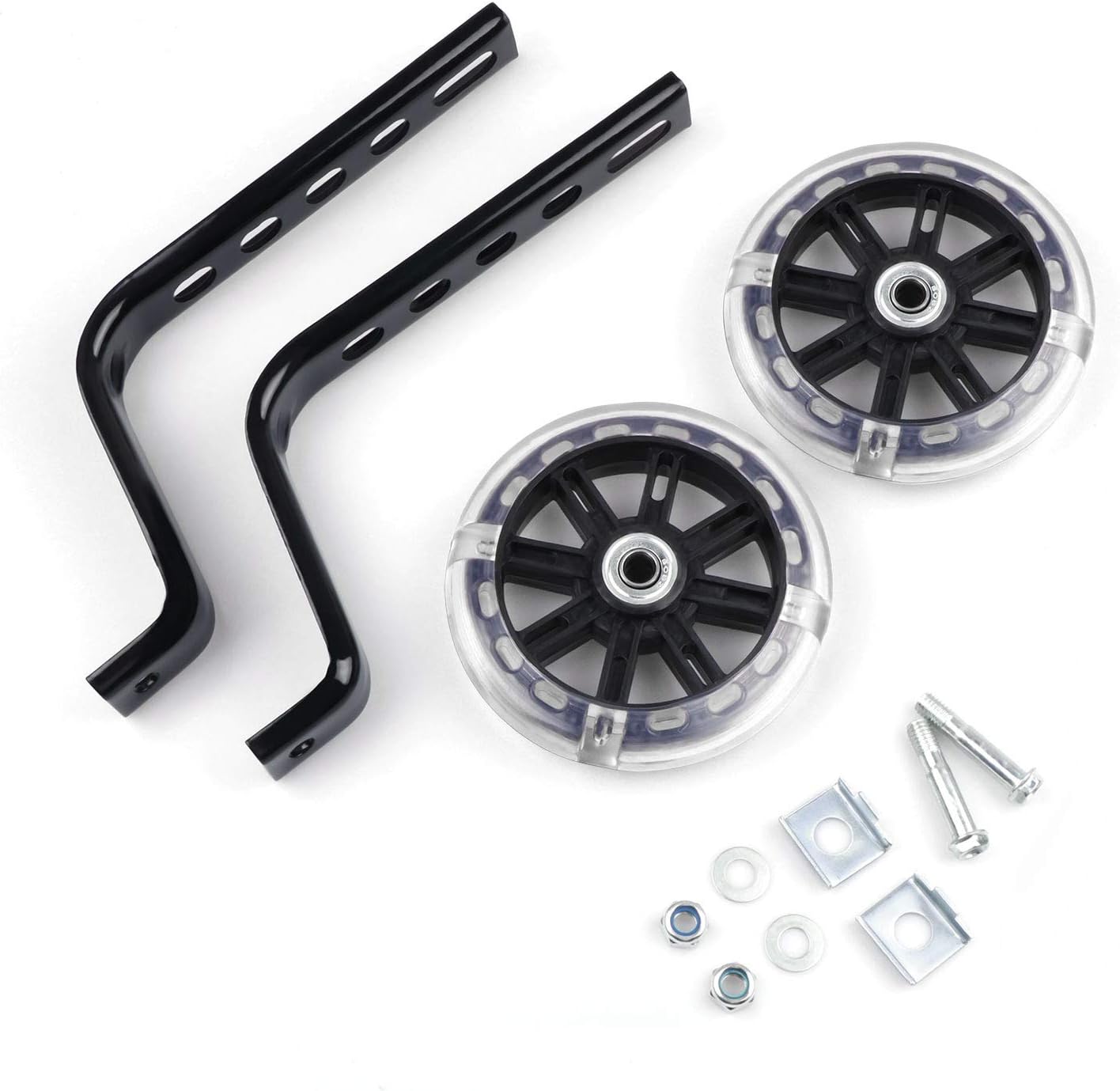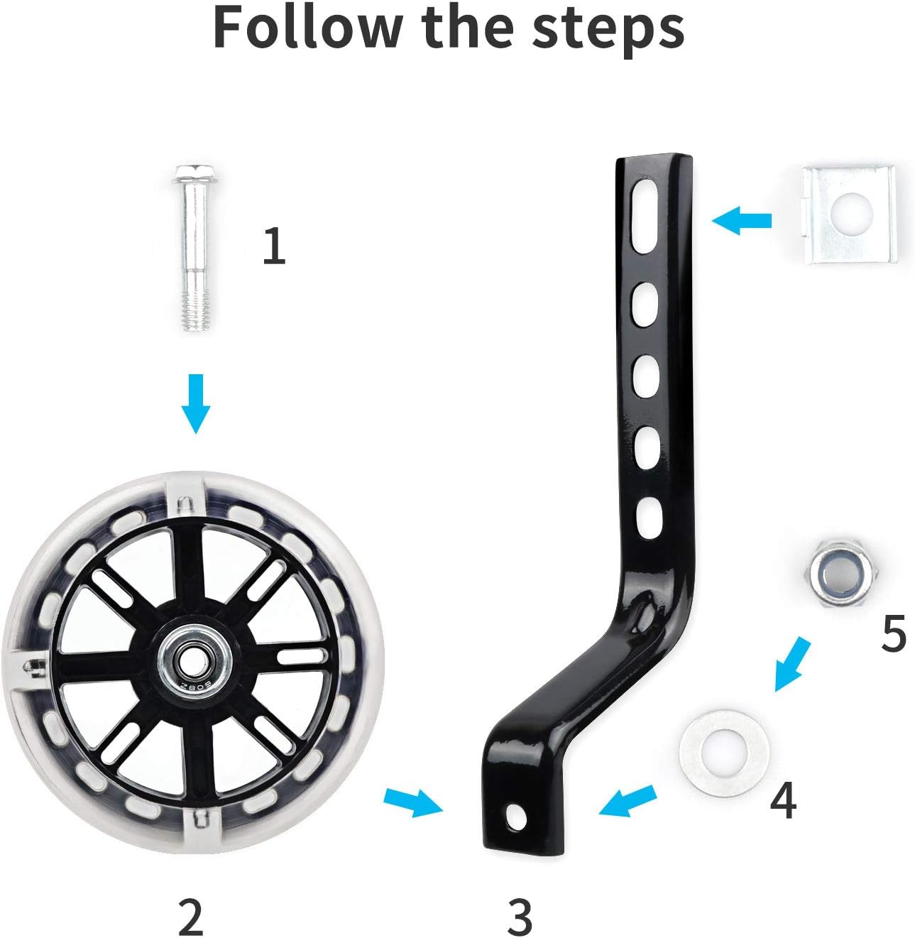 Package includes: A pair of training wheels, Installation accessories(2 x Shoulder Bolts, 2 x Washers, 2 x Locking Nuts, 2 x Limit Spacer), Multifunctional wrench, Reflective Stickers Material: The training wheels made of high quality plastic and rubber which it is anti-slip, wear resistant, providing stability. Light weight and noiseless. Design: Wheels light up when they spin above 1m/s smoothly, the product also come with reflective stickers creating much fun and enhance the safety of children cycling at night. Universal: Universal training wheels fits for 12/ 14/ 16/ 18 inch children's bicycles,you can adjust the height according to your own needs Easy to install: All mounting hardware is included, You can easily complete the installation.