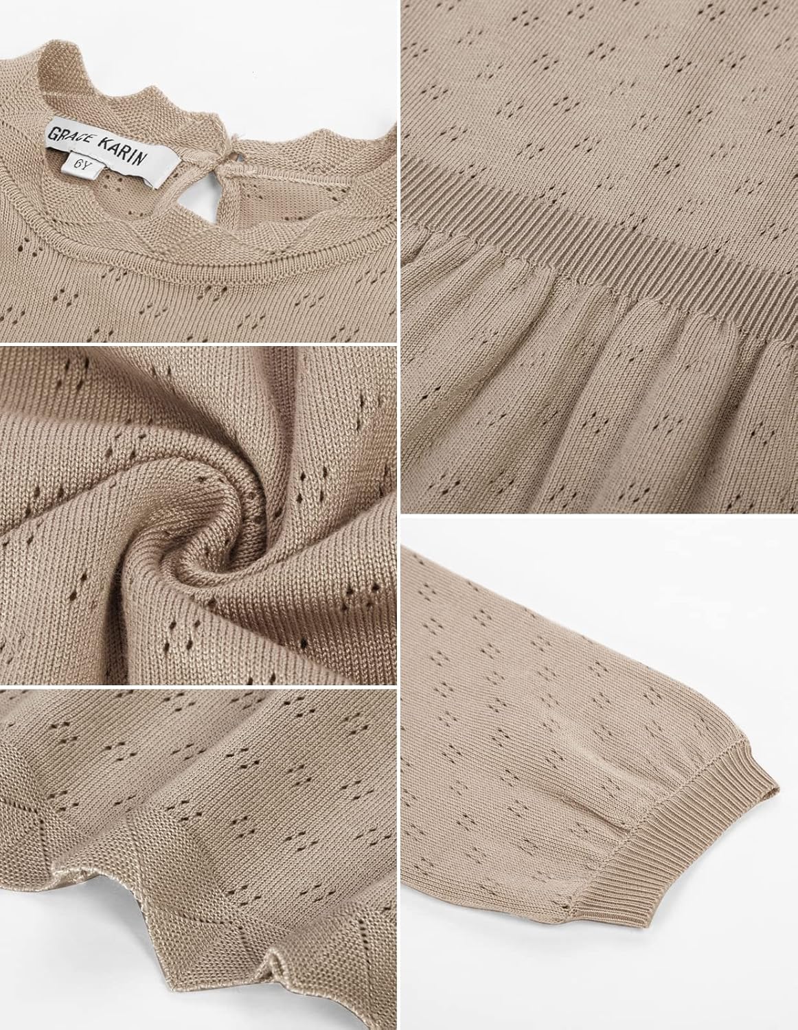 65% Viscose, 35% Acrylic Imported Pull On closure Machine Wash ?【Design】GRACE KARIN girl's sweater dress is adopted with eyelet knitted technology, It keeps your kids warm while still being comfortable, breathable, and fashionable. Crew neck with scalloped neckline, defined waist, Long bell sleeves, keyhole back with a button, and above knee length, making your girls more elegant, attractive and beautiful when back to school. ?【Fabric & Washing Care】The girl's fall dress is made of 65%Viscose+35%Acrylic, soft, stretchy, and lightweight, without pilling, well made as far as fabric and stitching. Not easy to wrinkle or fade. Low temperature(<30℃) water for hand washing is recommended, machine wash with a laundry bag is available; do not bleach and dry-cleaning. Please wash dark colors separately. ?【Size】Please refer to our size chart in both pictures and A+ content when purchasing the girl's long sleeve dress. Measurements such as height are a better guide than age in choosing the correct size. Any questions, please feel free to contact us, and we will solve your problem within 24 hours.
