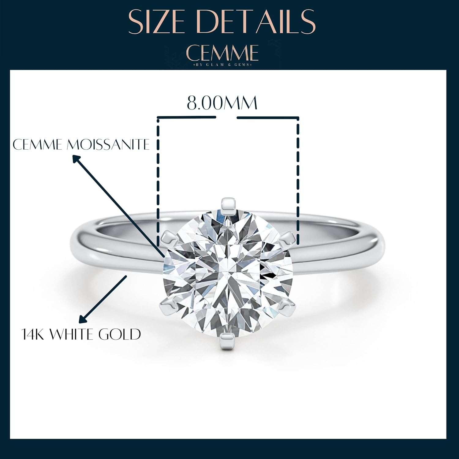 EYE CATCHING LONG LASTING LUSTER - The fine stone used on this luxurious Cemme moissanite Solitaire engagement ring for women will retain their sparkle for the years to come. The ring is made of 14k solid white gold that will surely steal the show BREATHTAKING SHINE AND SPARKLE - The Moissanite center stone dimensions is 8mm Diameter , D-E color which is very colorless and VVS clarity. Equal to 2 Carat Diamond . Moissanites are remarkably similar to natural diamonds and, on the Mohs hardness scale is, at 9.25, the second hardest to diamonds which is a 10 SIMPLE AND ELEGANT GOLD RING - This fantastic band ring is perfect for any age woman. It is suitable for everyday use or special moments, whether you're popping the question or simply looking for a romantic gif. ring sizes between 4.5 to 11 ELEGANTLY HANDCRAFTED - Perfect gift for an Anniversary, Birthday, Engagement, Valentine's Day, Mother's Day, Christmas, Hanukkah, or just any occasion and are a classic gift for any Woman such as a Bride, Bridesmaids, Fiancée, Wife, Girlfriend, Daughter, Granddaughter or even a Grandmother 100 % CUSTOMER SATISFACTION GUARANTEED - USA SELLER Your happiness always comes first for us. We offer a Lifetime Manufacturing Warranty on Jewelry, 30 Day Money Back Guarantee , Glam & Gems Appraisal Card and Glam & Gems gift box.