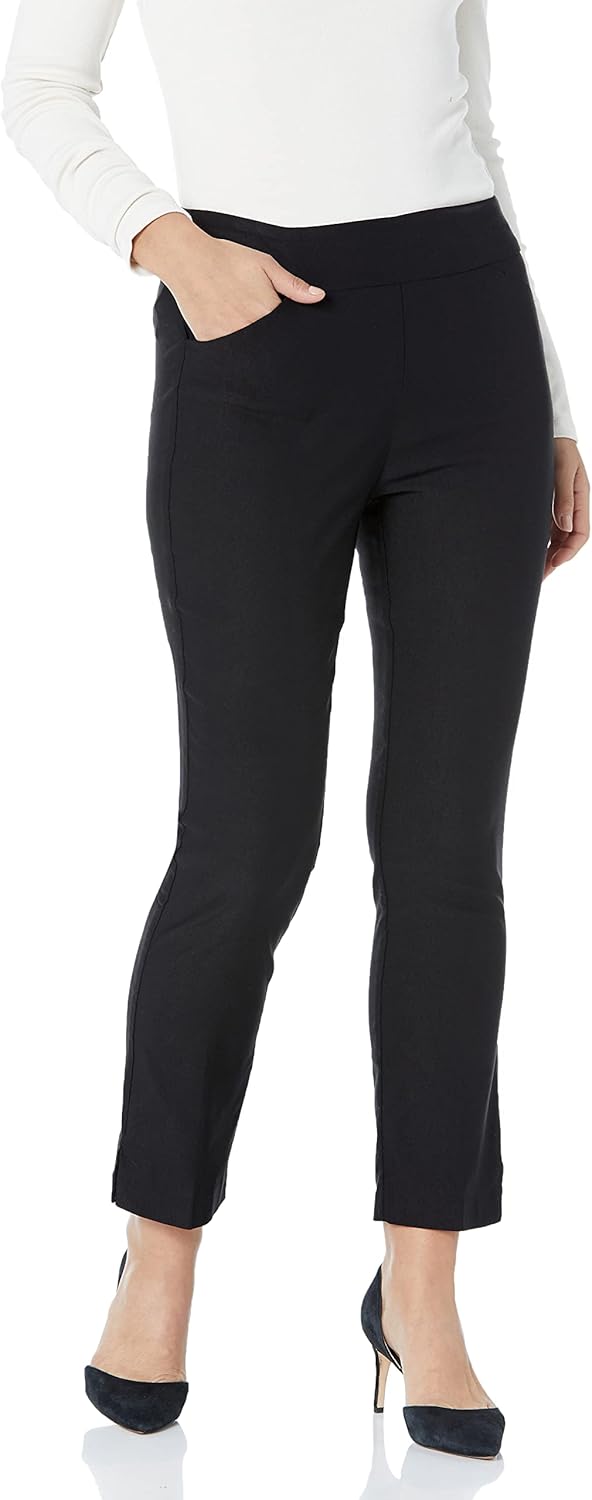 76% Rayon, 21% Nylon, 3% Spandex Imported Button closure MACHINE WASH DELICATE CYCLE COLD WATER, WITH SIMILAR COLORS, DO NOT BLEACH, LINE DRY, LOW IRON IF NEEDED Tummy slimming Pull-on flat waistband Slim (7 1/4" flat-laid) leg with side-slit hem 28" inseam
