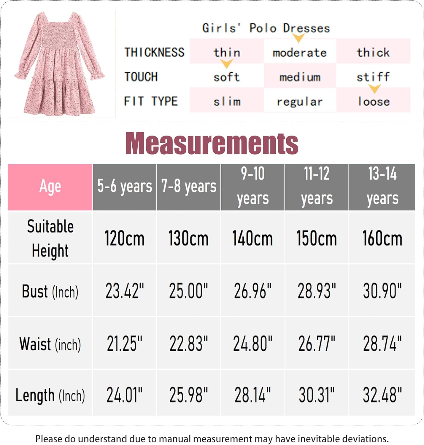 100% Polyester Imported Pull On closure Soft, lightweight, skin touch material, the dress will give your girls a comfortable and warm wearing experience. Features: This dress features shirred detail, flounce sleeve, square neck, high waist, ruffle hem. The dress goes great with any body shape and look just great on you whenever you decide to wear it. Delicate and sweet, the girl dress has endless styling opportunities! Perfect just as it is, or with layers for any special occasions she might have all year long! Hand wash or machine wash, line dry, do not bleach, that will increase the durability of your clothes. SIZE: 5-6 Years: 120CM; 7-8 Years: 130CM; 9-10 Years: 140CM; 11-12 Years: 150CM; 13-14 Years: 160CM. Fits from 5-14 Years, kids and teenagers. Please choose according to the SIZE CHART.