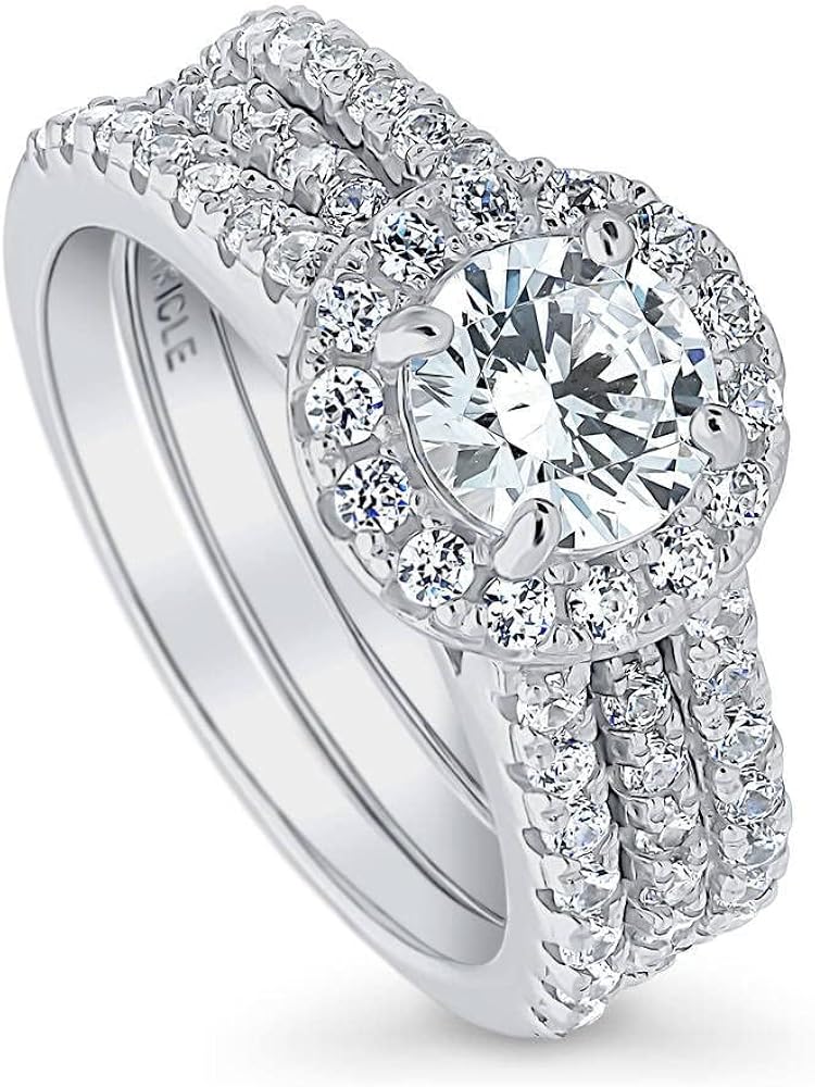 【METAL】 This halo wedding engagement 2 piece insert ring set is crafted with fine 925 sterling silver, plated with rhodium to enhance shine and durability. Nickel free for sensitive skin and won't turn your skin green if properly cared for. SIZING TIPS: This ring's band width is wide, so we suggest you choose a ring size 1/2 or 1 size larger than your standard ring size to make sure the ring will fit comfortably. 【STONE】 Main stone features 1 carat round cubic zirconia (6.5mm) in prong setting. Accented with 1.08 ct.tw round CZ (1.75mm) in pave setting. Berricle Zirconia is created in a way that truly replicates the cut, clarity and sparkle of a diamond. 【MEASUREMENTS】Ring measures 7mm in height. Band measures 6mm in width. This 2 piece halo insert ring set will enhance your look with its brilliant elegance and polished flair. 【FREE RETURN & WARRANTY】 Free return within U.S. Warrants against defects in materials and workmanship for 90 days; excludes general wear & tear and misuse. ? This ring is beautifully packaged in a free gift box, making it a perfect bridal wedding engagement rings for her or a romantic jewelry gift for Valentine's Day and anniversary. Layer on this stackable ring for the ultimate effortless style.