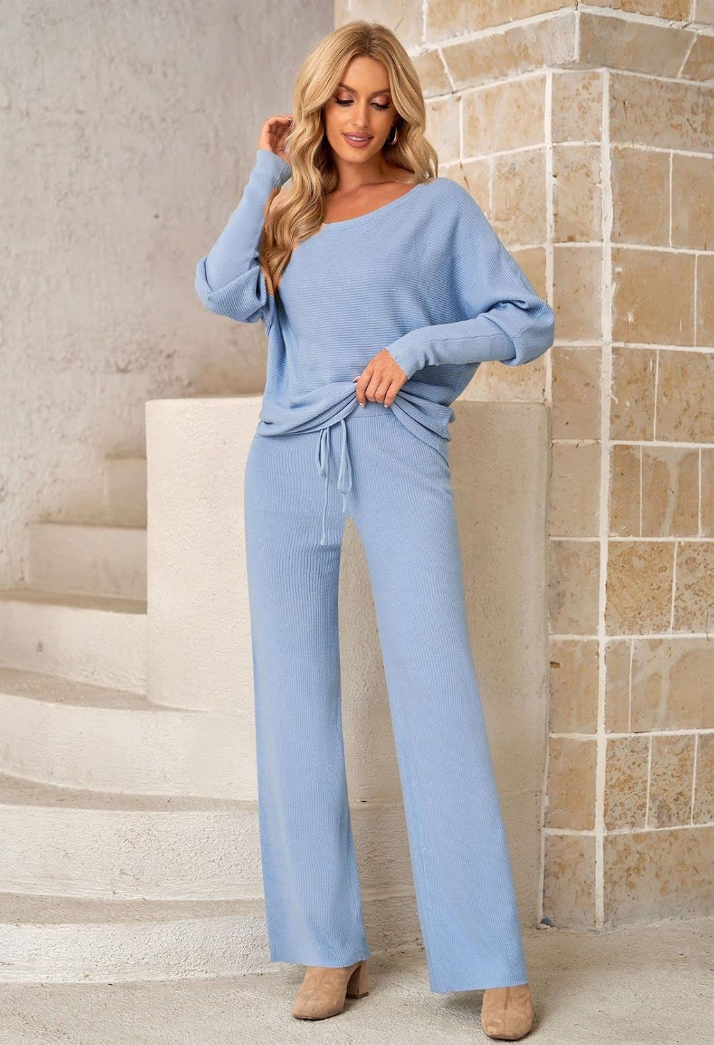 Womens One Shoulder Knitted Tracksuit Casual 2 Piece Pullovers Tops Drawstring Wide Leg Pants Lounge Set