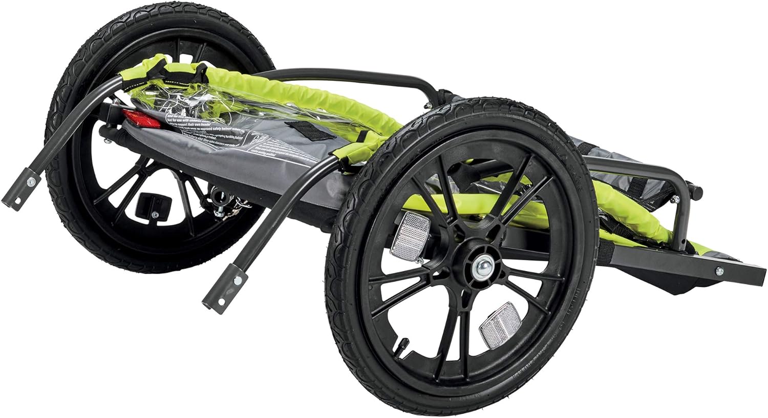 Lightweight steel construction trailer with durable quick release 16" wheels Safely and comfortably transports 2 children (up to 100 LB max payload) Large front and side windows provide a bright, airy cabin for your little rider Footguard tube protect passenger's feet, and a padded five-point safety harness comfortablely holds your child in place. Folding design with quick release wheels makes for easy transport and storage Sport type: Cycling