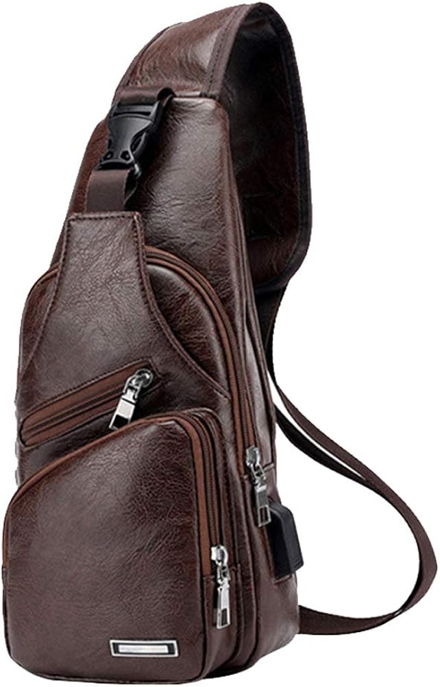Men's Leather Sling Bag,Chest Shoulder Daypack Waterproof Crossbody Bag with USB