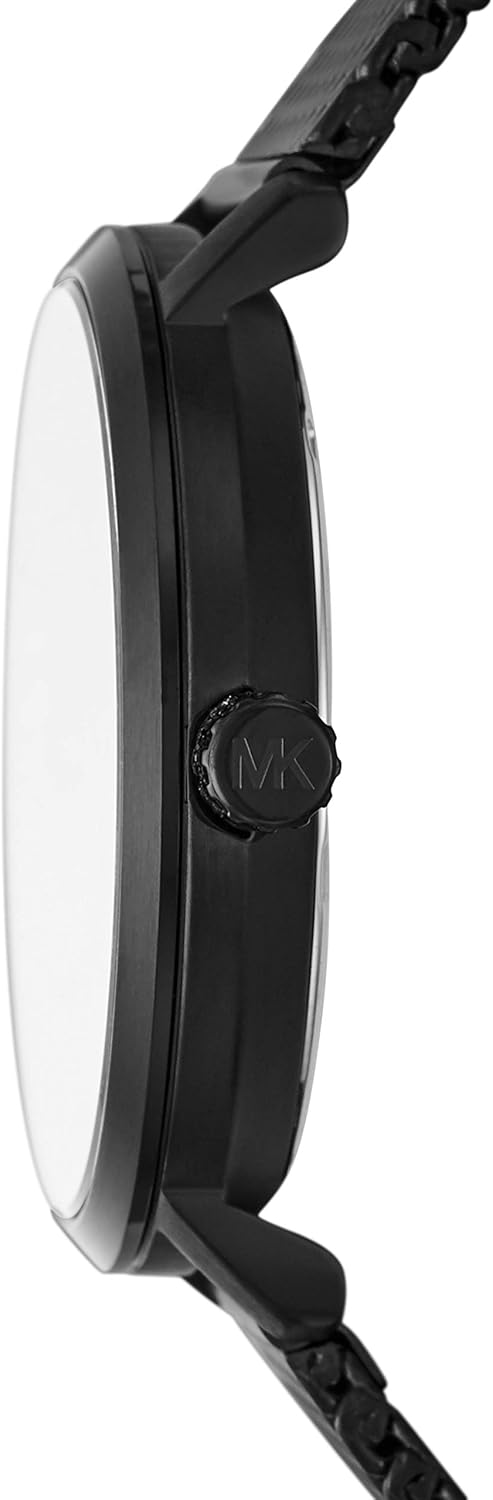 Michael Kors' Blake 42mm watch features a Black sunray dial with stick indexes three-hand Movement, Black IP Stainless Steel case case and Black stainless steel mesh bracelet 42mm case, 20mm band width, mineral crystal, Quartz movement with multifunction analog display, imported Round stainless steel case, with a Black dial Black, stainless steel bracelet Water resistant up to 50m: Wearable while swimming in shallow water