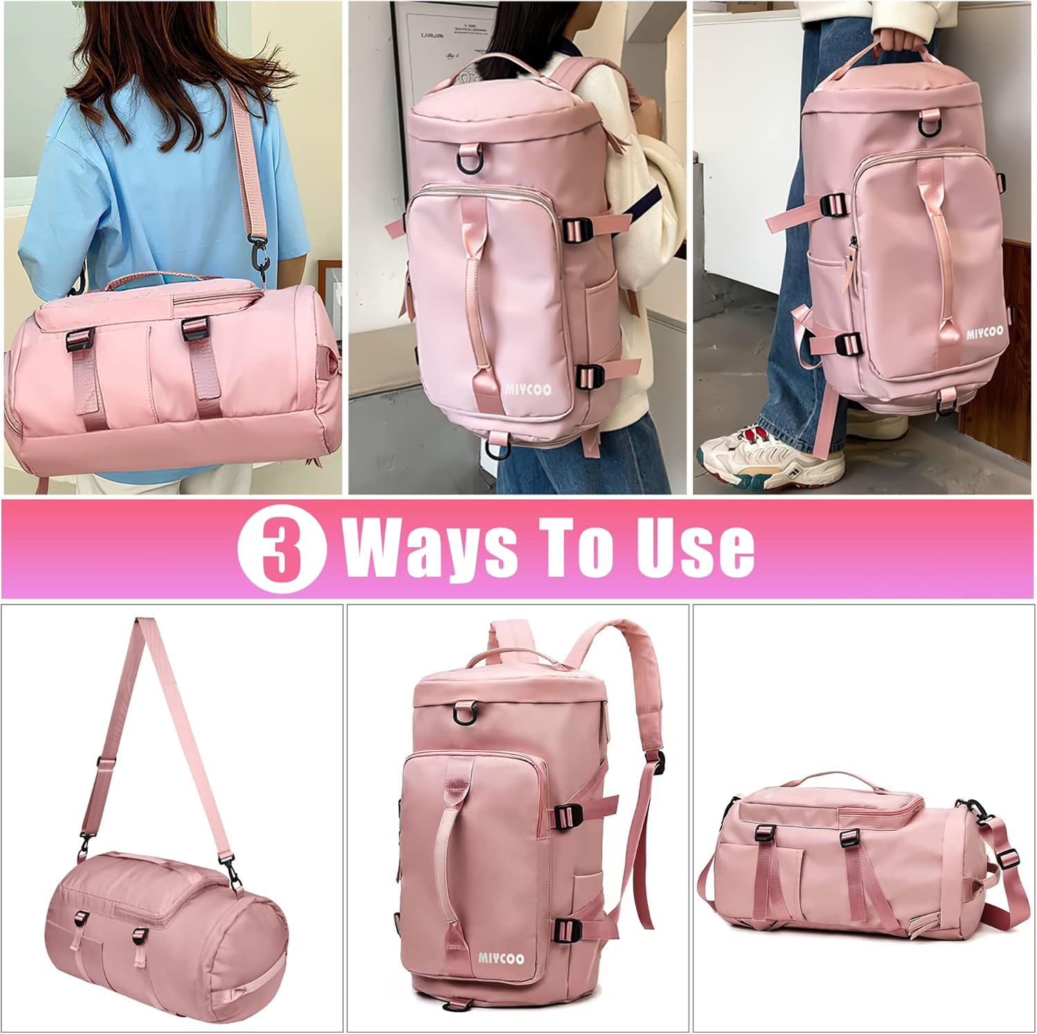 3-in-1 Use: This 3-way sports & gym duffle bag/backpack not only can be handheld, crossbody, but also as a backpack. Full-Length Shoes compartment: The separate shoes compartment keep your sneakers and dirty gear separated. Fits up to size 14 men's shoes! Wet Pocket: Hidden waterproof pocket is perfect for storing wet clothes and swimwear. Perfect for swim practice or sweaty workout clothes. Waterproof and Wrinkle-Free Fabric: Water droplets can easily slide off the fabric and will not absorb water. No visible wrinkles in the fabric. It keeps a good appearance even after long use. Travel Essential Work Out Bag: You can use this as a gym bag, carry-on bag, travel bag and everyday bag, perfect for exercise, cycling, gym, yoga, beach, pool, camping, practice days or weekend trips.