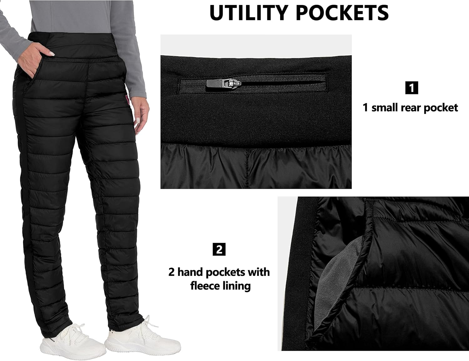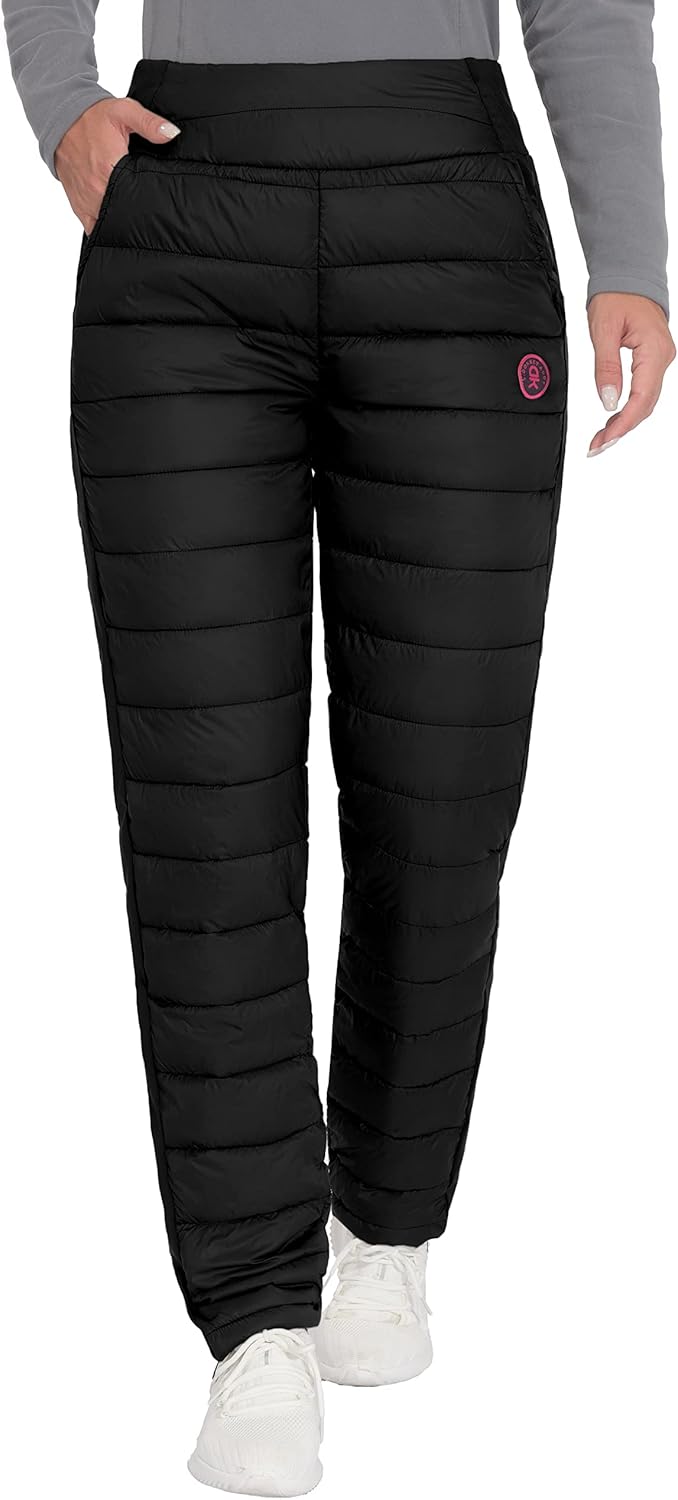 100% Nylon Imported Pull On closure Machine Wash and Hand Wash 【Puffy Down Sweat Pants】 100% Nylon puffer material can block the cold wind; Soft and fluffy down fiber filled. The women's puffy quilted pants will help lock the warmth under the smooth layer and warm you up. You can wear them in the house in the cold Winter as well as in outdoor's activities in Spring and Fall. Warm and skin-friendly 【Ultra-lightweight & Super Comfy】 Comfortable and breathable; Straight leg design and very lightweight, without being overly bulky like other puffy pants. Enough room to be comfortable and move around 【Wide Elastic Waistband】Elastic waist and pull-on closure make it easy to put on and take off. Thermal jogger style, you can put it on quickly and go out. High-rise waistband for better tummy control