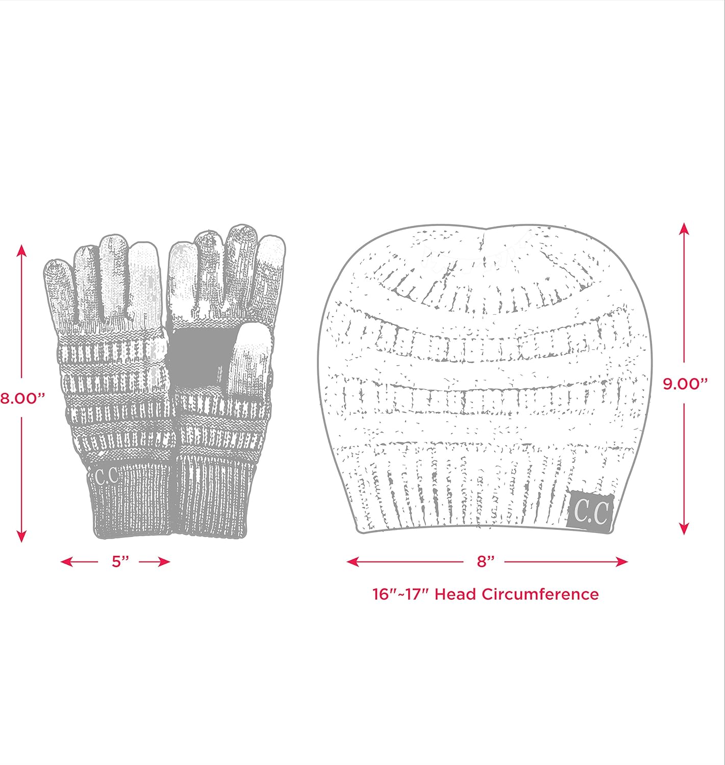 100% Acrylic Material: 100% Stretchable Soft Acrylic Hat Measurements: 57 cm, 22-3/8", Size 7-1/8 Glove Measurement: 10.0" x 3.75" Touchscreen smart finger tip, Faux suede palm for anti-slip grip Our comfortable & soft beanie hat keep your head and ear warm during the winter. This beanie can be worn both casual and sophisticated wear and also perfect for outdoor fashion, including biking, camping, ice skating, snowboarding, running and more.
