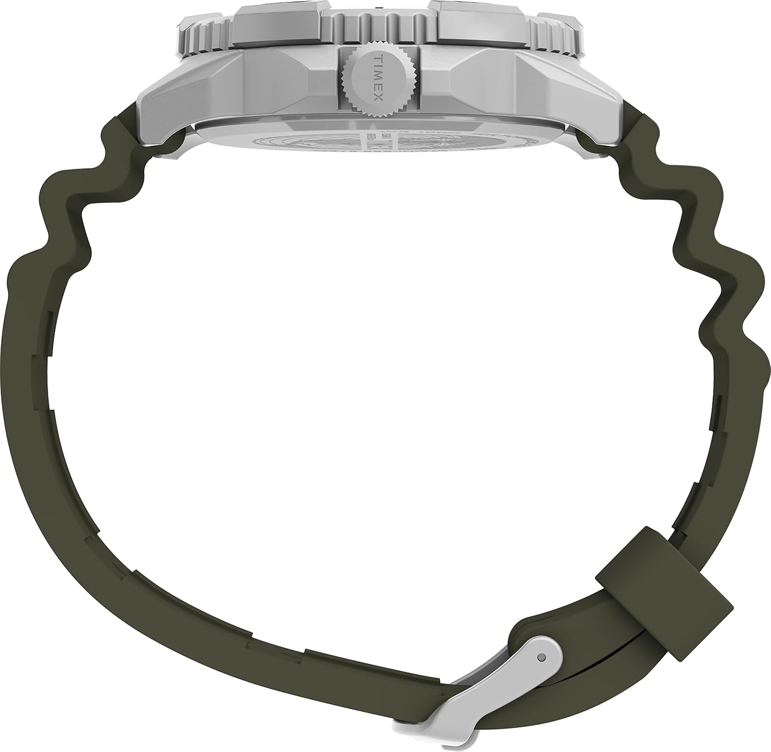 Imported Adjustable 20mm silicone strap fits up to 8-inch wrist circumference Dial with full numerals; date window at 3 o'clock 41mm case with mineral glass crystal Indiglo light-up watch dial; luminous hands Water-resistant to 100m (330 ft): In general, suitable for snorkeling, as well as swimming, but not diving