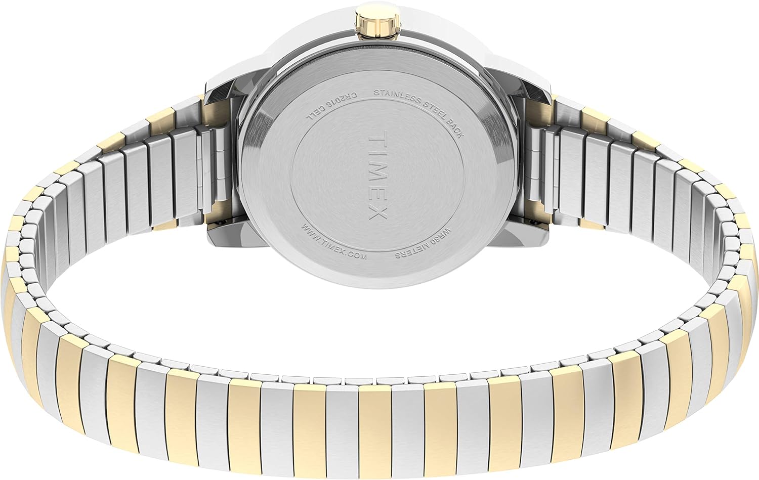 Imported Two-tone 12mm stainless steel expansion band fits 6-to-7.5-inch wrist circumference White easy-to-read dial with date window at 3 o'clock; full Arabic numerals Two-tone 25mm brass case with mineral glass crystal Indiglo light-up watch dial Water resistant to 30m (100ft): in general, withstands splashes or brief immersion in water, but not suitable for swimming or bathing