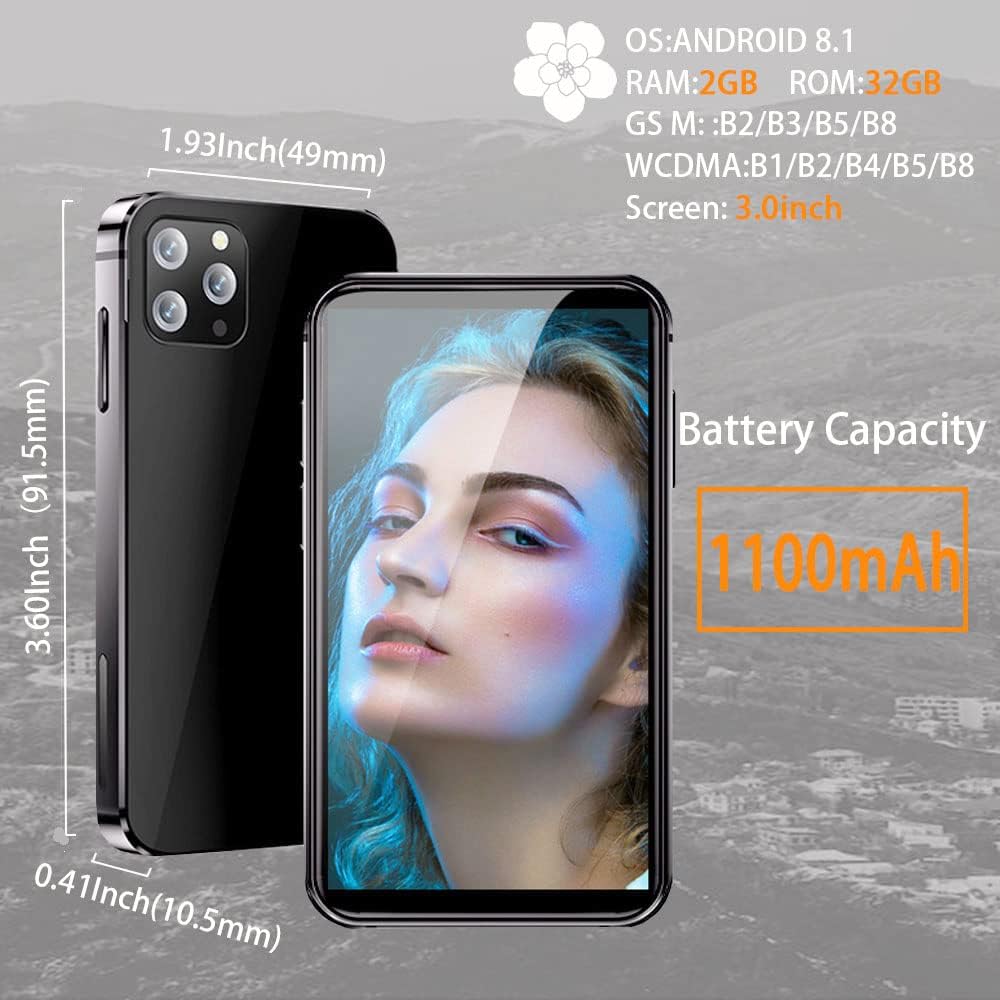 About this item ?UNLOCKED CELL PHONE: The mini cell phone is unlocked which compatible with all 2G and 3G network in US including T-mobile, VERIZON, AT&T, Straight Talk, NET10, MetroPCS, Google Project Fi, etc. ?SUPER MINI SMARTPHONE : 3.0 inch you can put it in your wallet it is very portable.suitable for travel and daily life and work time.We send to protect case for free, no worried about damage. ?SCREEN SIZE : Adopting original high resolution screeen. Your eyes will always feel comfortable. Resolution:480*854. Body Size:3.60*1.93*0.41 inch. ?FUNCTIONS: It support Calling , MP3 Playback , Player ,Touchscreen, Memory card slots,FM Radio,Message,Wi-Fi, Bluetooth, Front Camera, Gravity Response,E-mail.GPS;GPRS;WIFI 2.4G;WIFI Hotspot;OTA ?COMFORTABLE: Very suitable for our palm,tempered glass back cover,makes you feel comfortable from all sides due to the high tech artwork and precise design. ?CPU: MTK6580 Quad Core 1.3GHz. 2GB RAM 32GB ROM Battery:1100mAh li-polymer battery.1100mAh li-polymer battery stand over 5 days.If you have any questions,you can contact us,we will reply you within 24 hours.
