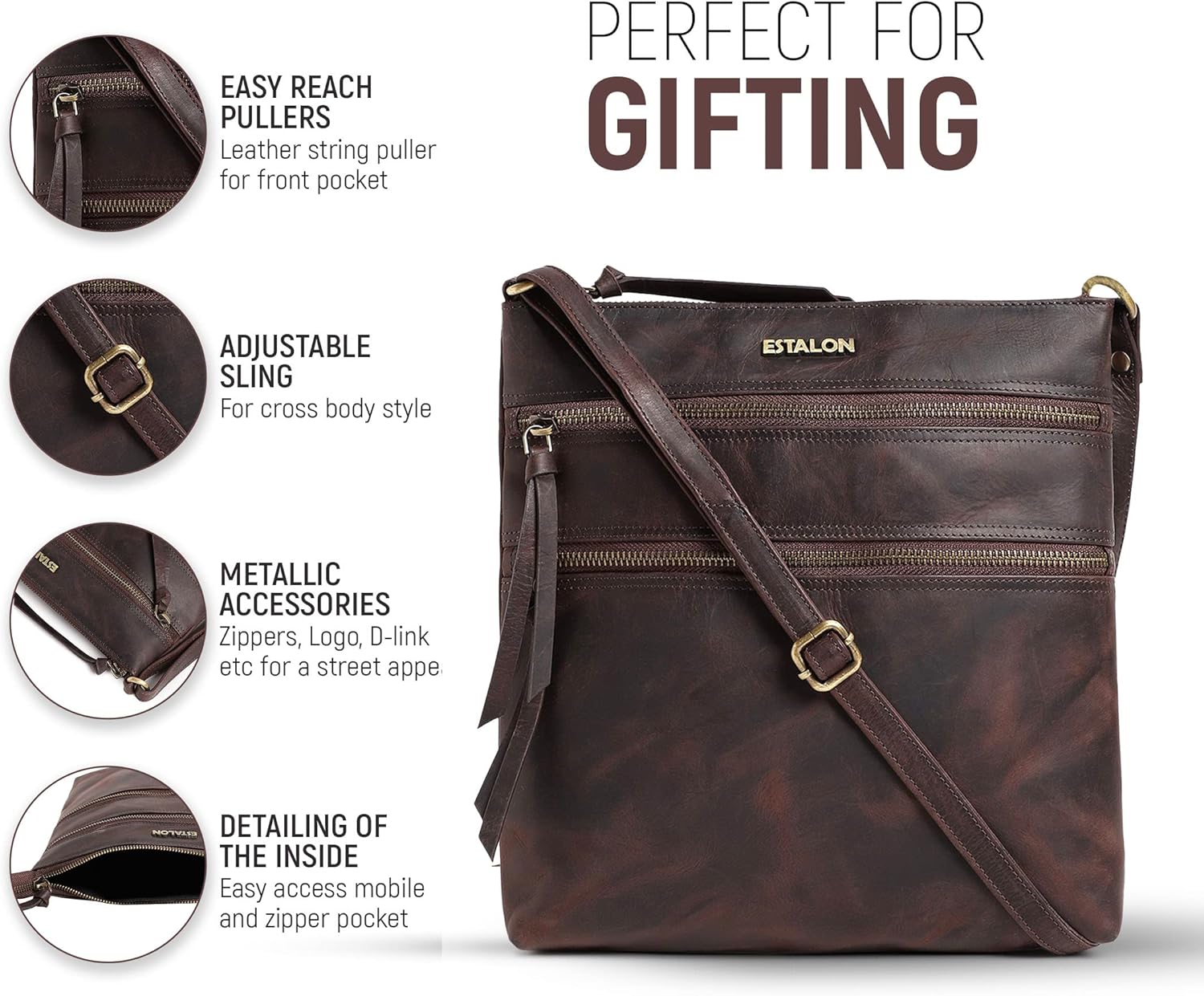 Genuine Leather Made In India. Kiss Lock closure 100% GENUINE LEATHER: Forget the feel of PU and faux leather with our authentic cowhide leather crossbody bag. Crafted from 100% oil-rich genuine leather, our Mocha Brown crossbody bag adds a fashionable touch to your wardrobe. The supreme quality bag has a smooth leather-like feel and smell which gets softer and better with every use. It is designed to resist wear and tear making it a versatile choice for your day to day use. SMART CONSTRUCTION & STYLE: All a women’s purse needs are spacious compartments and gorgeous looks and our handcrafted cross body bag fulfills both. This handcrafted multi-pocket women’s purse has 3 exterior zip compartments, 1 interior zip compartment, a fully lined bill compartment, and a mobile holder to carry your belongings. Our handbag 9.5 x 9 x 2 inches and comes with a strong strap buckle fitting which gives it a sleek and modern aesthetic look. PREMIUM QUALITY: Enjoy the perfect mix of durability, softness, and utility with our women’s crossbody leather bag. Made with real leather, each stitching on the satchel is sewed with special care by professional artisans to make it timeless, lightweight, and fashionable. Every bag goes through a series of quality checks to ensure the best quality is delivered to you. The casual-cool over the shoulder look of this luxury purse brings a stylish and vintage flair to all your looks. EASY EVERYDAY USE: Wear it to a summer work party or a regular office day, this perfect satchel is designed for all-day comfort. The cute cross body bag has a long adjustable strap that can be adjusted from 20 inches to 26 inches as per your needs. It can also hold all your personal belongings like mobile phones, wallets, credit cards, or even cardholders with absolute ease. Unlike those large handbags, you can well organise your items in this small and practical sling bag. NO HASSLE MONEY BACK GUARANTEE: Mother’s day, anniversary, or birthday, this elegant sling bag is a divine gift idea for your mom, wife, or girlfriend alike. The leather crossbody satchel is the perfect combination of style, softness, and durability that is loved and adored by all. However, if this combination doesn’t fit the bill for you, feel free to reach out to us. Our customer service team will assist you, and we’ll offer a full refund, or free replacement, whichever you prefer.