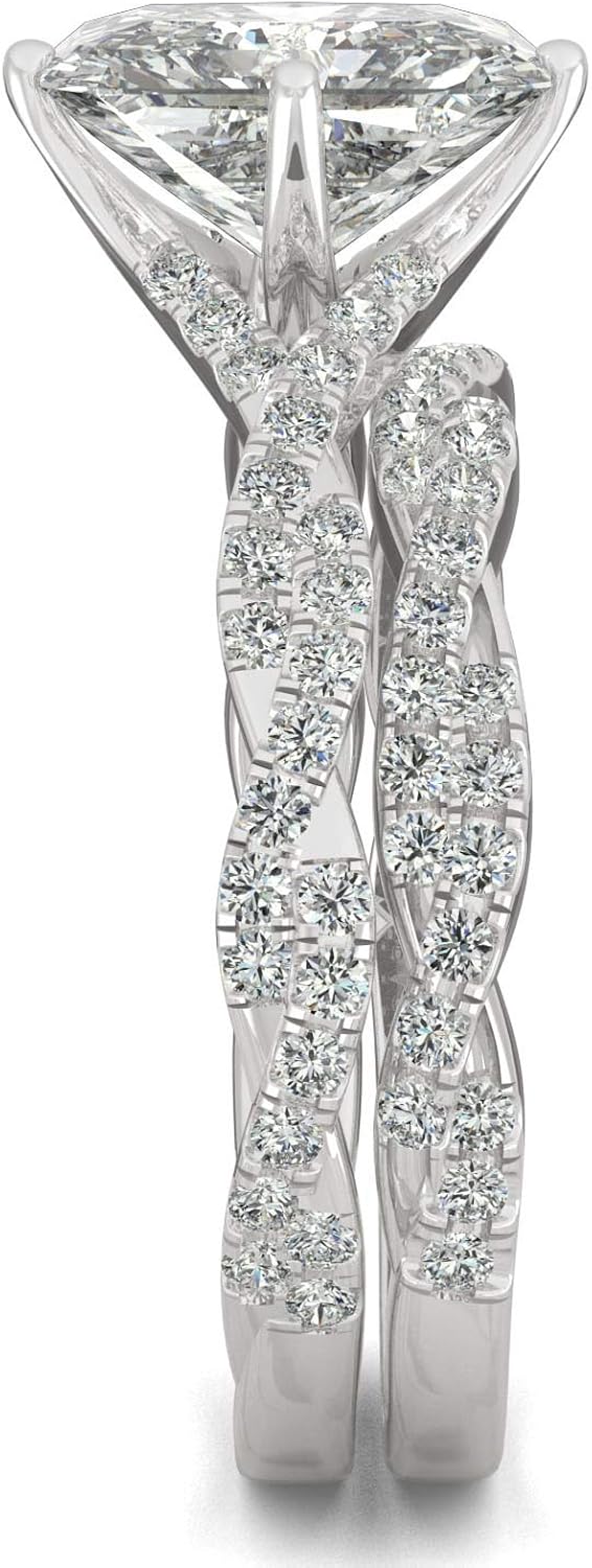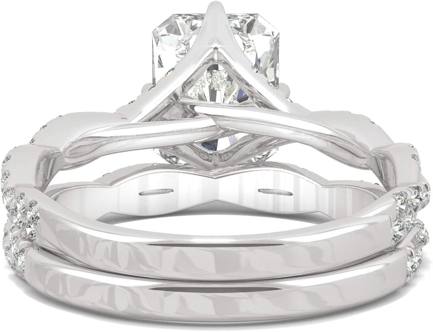 ABOUT THE JEWELRY: This charming bridal set showcases a 9x7mm radiant cut Moissanite by Charles & Colvard gemstone. Beautifully crafted in rhodium plated 14K white gold and secured in a four prong setting. Ring size 5 CARAT WEIGHT INFORMATION: The Total Diamond Equivalent Weight (DEW) is 3.42cttw (Actual Weight 3.02cttw) LABORATORY-GROWN GEMSTONE: Introduced in 2018, "Moissanite by Charles & Colvard" is a beautiful gemstone in a near-colorless (G-H-I) color grade (may contain ever-so-slight imperfections in clarity, cut or polish) and is a revolutionary value. ABOUT MOISSANITE: Moissanite created by Charles & Colvard is the most brilliant gemstone and is among the hardest minerals on the planet. It scores 9.25 on the Mohs scale for hardness and is more durable than sapphire, ruby, or emerald. BUY WITH CONFIDENCE: Based in the US for more than 20 years, Charles & Colvard is the original creator of moissanite. Our moissanite is covered by our limited lifetime warranty. There is a difference, insist on Charles & Colvard.