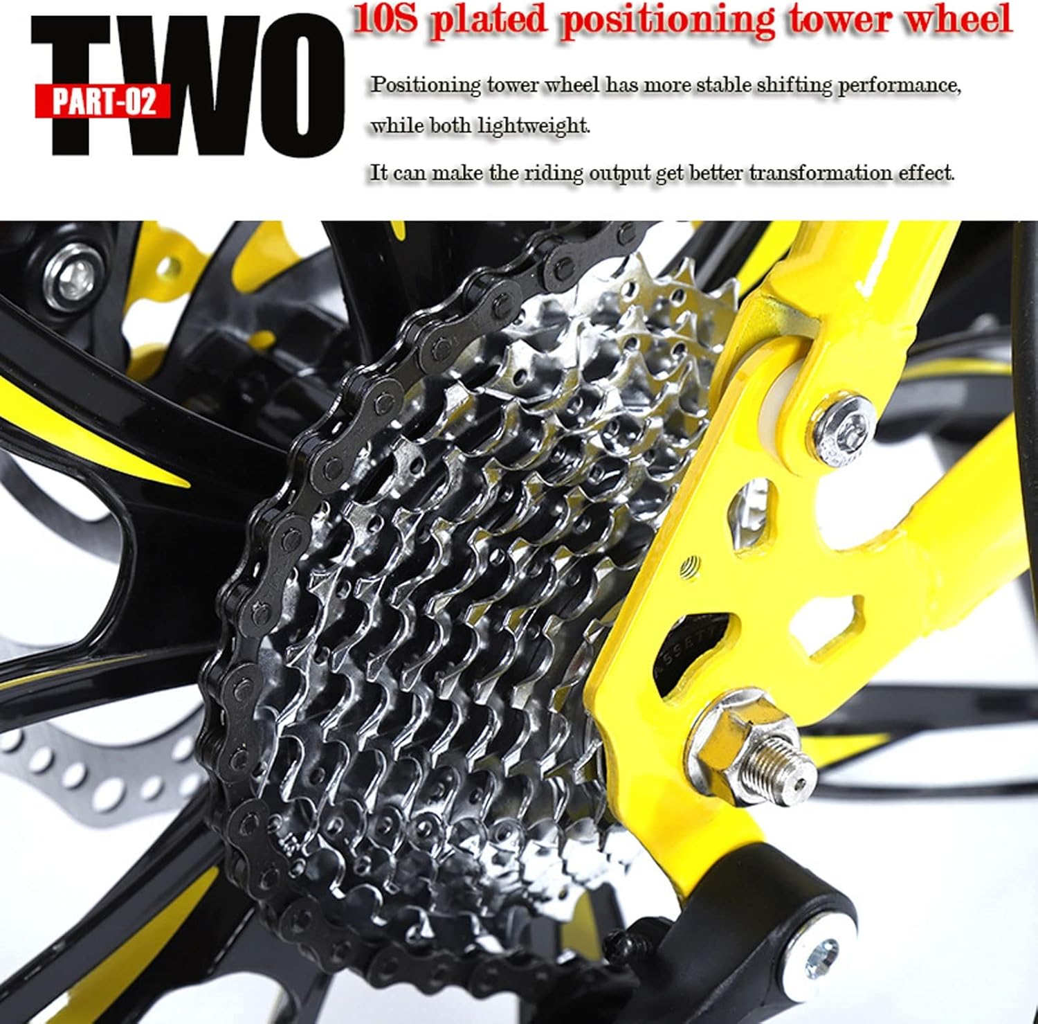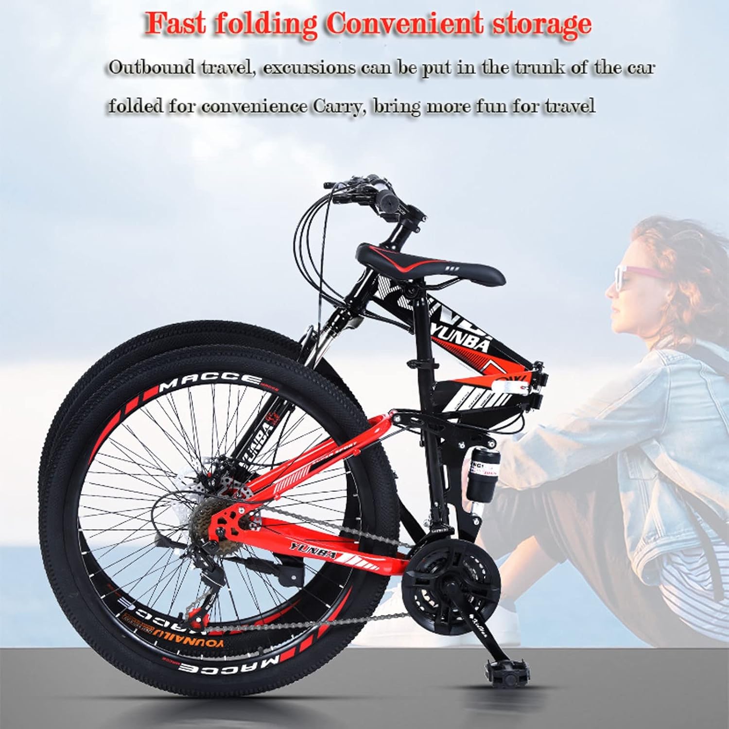 【Folding Design】: Bicycle, Fast folding, 24/26 inch mountain bike, folding design provides more possibilities for outings, lightweight and easy to carry, outings can be put in the trunk of the car, no tools, easy to fold, can be taken anywhere, high elastic shock comfortable cushioning, bring more fun for travel.     【Smooth Shifting】: Folding Mountain Bike for Men and Women, Micro rotation / blueprint system, short shifting stroke, clear shifting, fast and effortless shifting, 10S electroplated positioning tower wheel, positioning tower wheel has a more stable shifting performance, while both lightweight, can make the riding output to get a better transformation effect.     【Special Tires】: Shift Folding Shock Absorbing Bike, Mountain special off-road tires, mountain special tires, thicker, wild, with good grip, low rolling resistance, riding effort, lockable shock fork, dual-use shock fork, fork locking road riding speed faster, locking open off-road riding shock comfortable.     【Strong Braking】: Mechanical disc brake brake, automotive brake braking method, sensitive, fast, not affected by bad weather, to protect the safety of riding, ergonomic saddle, racing-grade narrow saddle, so that the legs are easy to ride to reduce leg friction, ride faster, long sitting not tired.     【Assembly】: 85% of the assembly of the mountain bike is complete when it arrives at your doorstep, all you need to do is fix the front wheel, pedals, handlebars, seat, and fill the tires with air, and you can enjoy the ride!