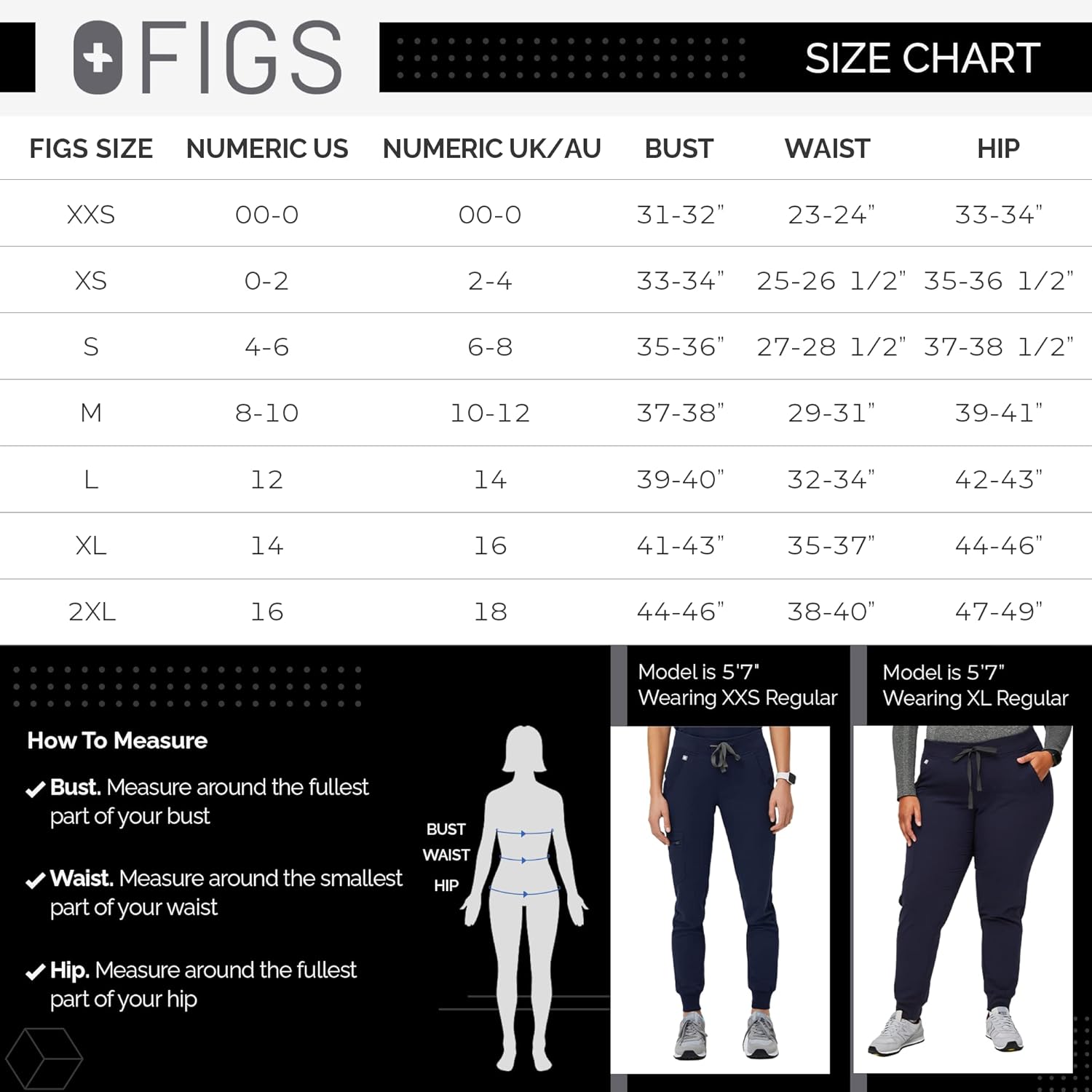 HIGH PERFORMING DESIGN — Engineered with Technical Comfort that incorporates moisture-wicking, anti-wrinkle, and Silvadur technology which provides odor protection. FIGS Zamora Jogger scrub pants for women will leave you feeling comfortable throughout your long work days. STYLISH AND PROFESSIONAL LOOK — These jogger scrub pants provide a modern, clean, and tailored slim fit so you will look stylish and professional without sacrificing comfort and function. PERFECT FIT WOMEN’S SCRUB BOTTOMS — Choose your FIGS size for the best fit: Petite inseam: 27”, for heights up to 5’5”; Regular inseam: 29”, for heights 5’6” - 5’8”; Tall inseam: 31”, for heights 5’9” and above. EXPONENTIALLY MORE WEARS THAN OTHER BRANDS — FIGS scrubs are thoughtfully designed to provide an unmatched combination of comfort and technical features that give you exponentially longer-lasting scrubs. LOTS OF COLORS TO CHOOSE FROM — Available in sleek and modern colors from Black, Burgundy, Capri Blue, Graphite, Navy Blue, and Raspberry Sorbet. FABRIC AND CARE — 72% Polyester; 21% Rayon; 7% Spandex. Wash cold inside-out, tumble dry low. FIGS HELPS AWESOME HUMANS LIKE YOU — All FIGS scrubs are named after places they have donated scrubs and people they have met along the way! Show more