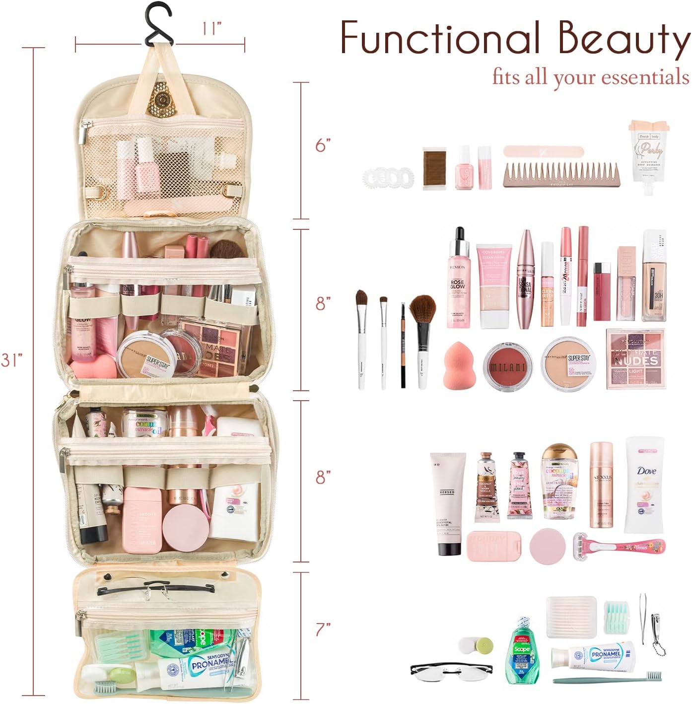 ? [STYLISH AND SOPHISTICATED] Feel pretty using a chic toiletries bag with gold accents, a perfect gift for her, girlfriend or yourself ? [STRONG AND DURABLE] Easy zip closures, sturdy handles makes this travel pouch ideal for travel essentials & esthetician supplies. Dimensions - 9x11 inches (closed) 11x28 inches (opened) ? [NEAT AND ORGANIZED] 1 removable pocket, 1 breathable mesh pocket, 2 pockets with bottle holders. Compact but with space for all your makeup brushes, hair accessories for women ? [PRACTICAL AND FUNCTIONAL] This hanging travel toiletry bag can be hung using the metal hook, chain or handle. Material is waterproof and easy to wipe down, has clear pockets for airport & plane travel ? [BONUS] These traveling bags (Excluding color Black) includes 3 silicone travel size bottles, leakproof and easy to clean. This is a travel must haves for traveling essentials & travel accessories for women