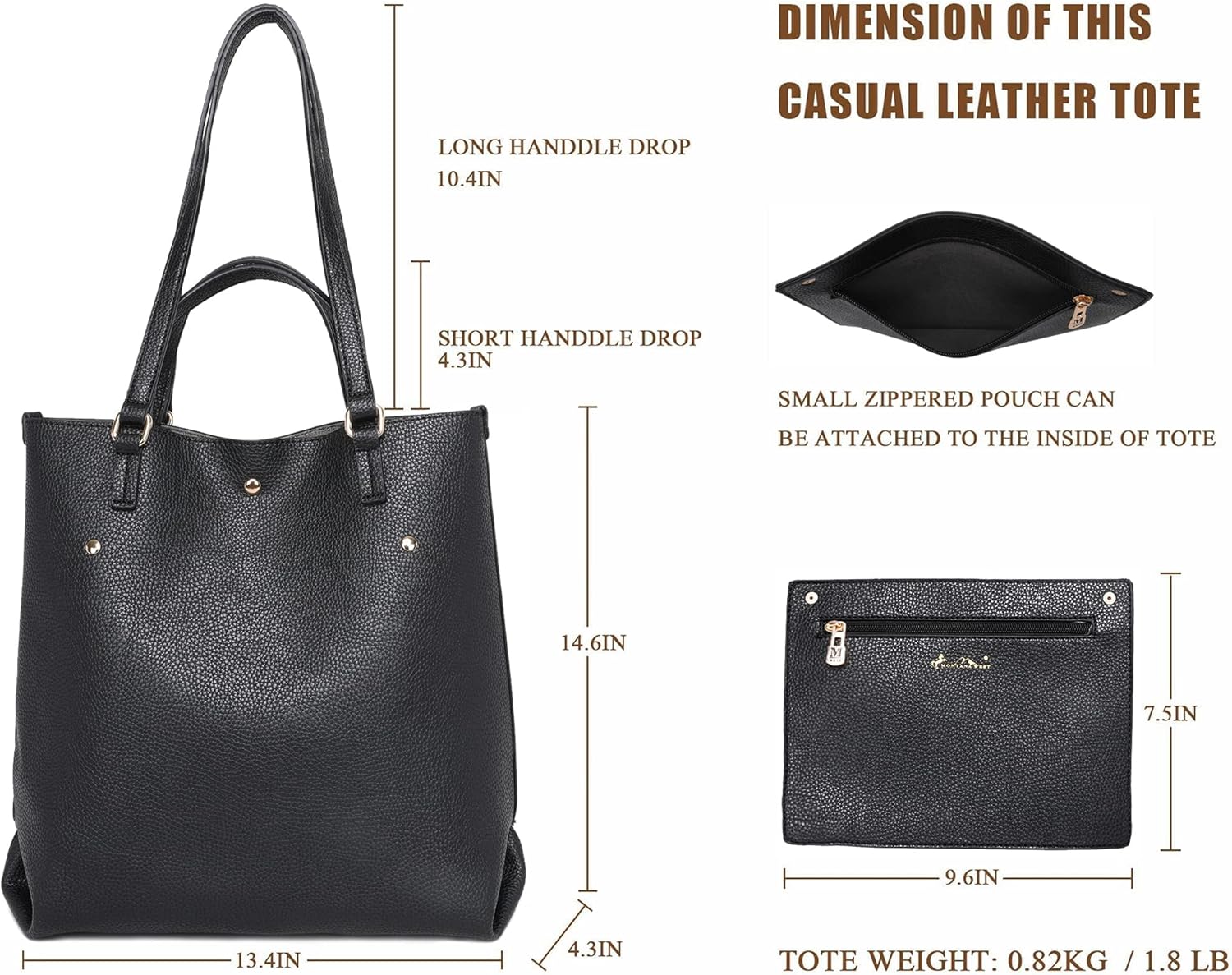 Vegan Leather Made in the USA and Imported ?【PERFECT DIMENSIONS】Our classic large tote bag's dimensions are about: 13.4" x 4.3" x 14.6"(L x W x H);? small inner pouch size: 9.6'' x 7.5"(L x H). Straps Height: 10.4", Top Handles Height: 4.3", Weight: 1.8 lbs. Our vegan leather handbag has plenty of room to fit all your essentials, including your 13'' laptop, clothes, umbrella, bottle of water, books, etc. 【THE WOMEN’S CLASSIC TOTE BAG】Made of very good vegan leather, by professional craftsmen; detailed stitching with durable material, ensure that the women's handbag can be a perfect gift with long-lasting use. 【VERSATILE BAG】Our tote bag can be worn as a top handle bag, but if you need your hands free it can be worn like a shoulder bag, that way you can use your phone, or even eating and walking at the same time. 【MONTANA WEST TOTE BAG’S STRUCTURE】Our ideal shoulder handbag comes with only 1 compartment, but roomy enough to carry all your essential belongings. There also is a detachable inner zipper pocket, which can carry your small stuff, such as your phone, keys, cards, or earphones. The magnetic closure is here to keep your belongings in your bag, and to allow you to access them easily. 【SATISFACTION GUARANTEE】Montana West is an American company based in Dallas, we are proud to offer this product and support it. If you have any problems our customer service team will gladly assist you, and will do their best to make you satisfied. GREAT GIFT IDEA - Mother, daughter and friends will love our products.