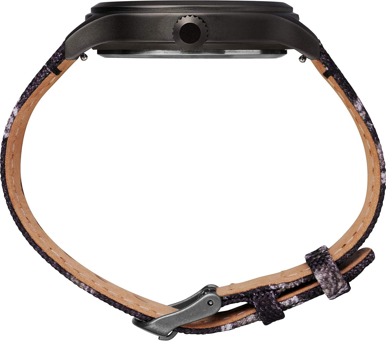Adjustable 20mm fabric & leather strap fits up to 8-inch wrist circumference; quick-release spring bars Strap features Mossy Oak Eclipse camouflage print Black dial with date window at 3 o'clock; full Arabic numerals Black 43mm brass case with mineral glass crystal; Indiglo light-up watch dial Water resistant to 50 m (165 ft): In general, suitable for short periods of recreational swimming, but not diving or snorkeling