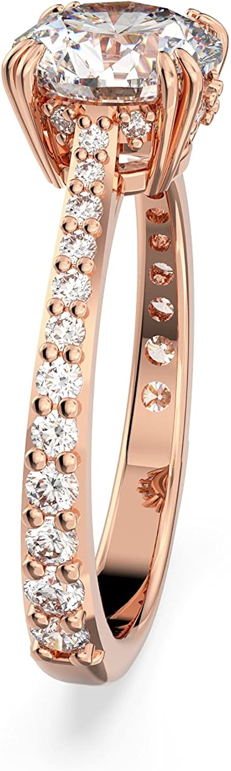 Measurements: Size 5, EU 50 Timeless and elegant: Proving there is power in simplicity, this ring emulates the sparkle and gleam of the stars at night, with its clear Swarovski crystal on a rose gold-tone finished setting Break the rules of style: Innovation meets inspiration with this Constella ring, which holds a dazzling princess cut center stone, enhanced with a shimmering pavé embellishment Precision meets artistry: Set with meticulously cut crystals that refract light to allow for maximum sparkle in the way that only Swarovski crystals can, for a design that celebrates individuality Designed to last: Swarovski jewelry maintains its brilliance when simple care practices are observed; remove before contact with water, lotions, or perfumes and polish with a lint-free cloth Items delivered: (1) Swarovski Constella ring with clear sparkling crystals, princess cut centerpiece, on a rose gold-tone finished setting, size 5, complete with Swarovski ring box
