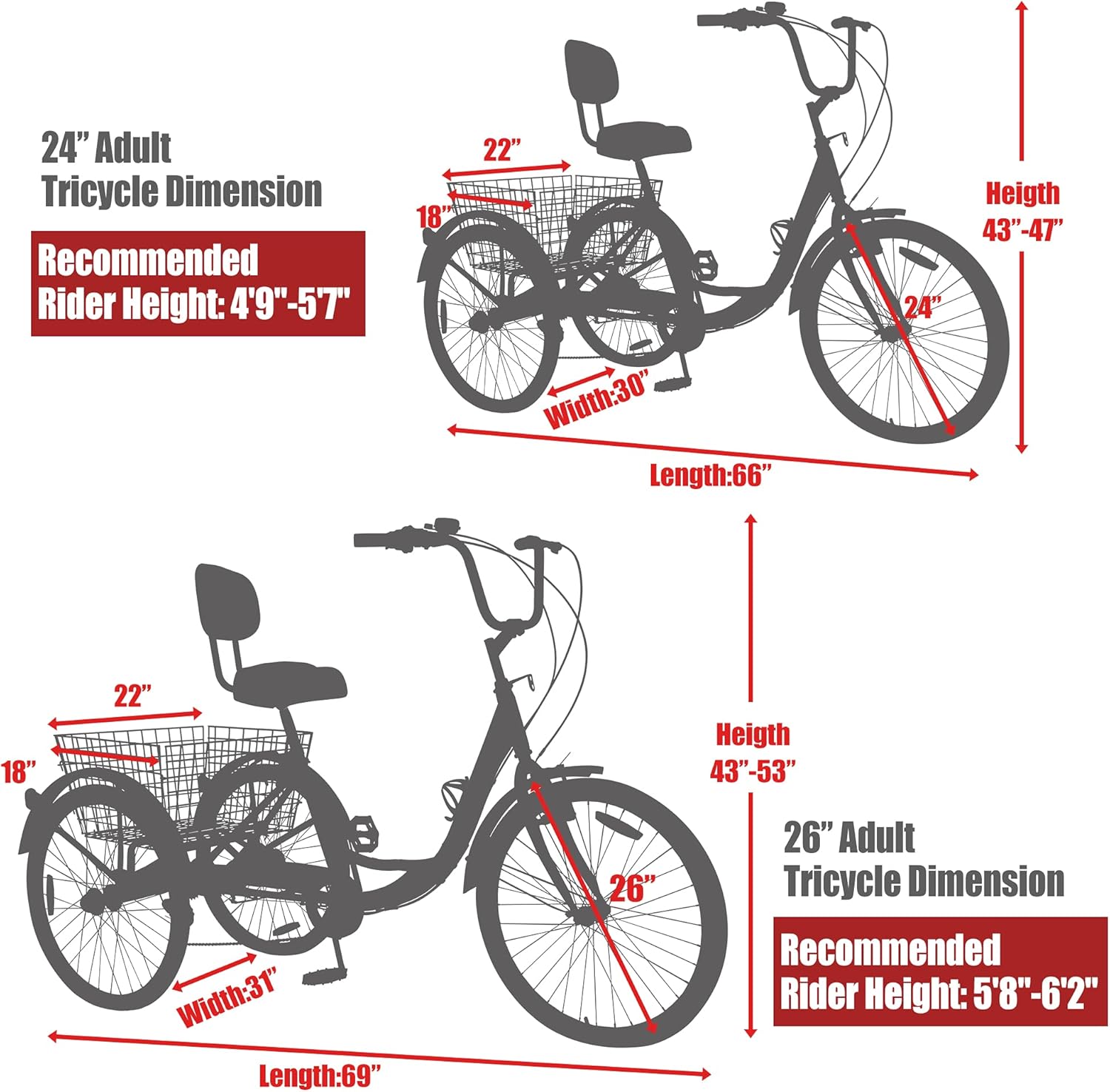About this item Sturdy Balanced Structure: Ey adult trike bikes take advantages of high-grade steel bike body and alloy rims for solidness and durablity, 3-wheel triangle structure for better stability, low step-through design for friendly ride on with 350 lbs load capacity Comfort Bike Seat: Ergonomic & oversized design makes riding more comfortable with soft cusion for great shock-absorption, dual-bar backrest support, and adjustable height. Dimension: 9.5"(L) x 11.5"(W) Large Cargo Basket: Ey adult tricycle comes with a large rear basket making it convenient to carry daily grocery or your pets. Load weight up to 50 lbs. Dimension: 22"(L)x18"(W)x12"(D) Easy Up Hills: 7-speed Shimano derailleur drivetrain makes it easier and less effort to ride on hills or other terrains with front and rear fenders keeping your clothing and the trike bike clean What You Get: Ey Adult Tricycle 3 Wheel Bike (user manual, installation tools, water bottle holder, gloves and a gift item), worry-free One-year Warranty and friendly customer service. Replacement parts are offered at no charge. If you're not satified - FOR WHATEVER REASON - we’ll replace it or give you your money back. Buy with confidence!