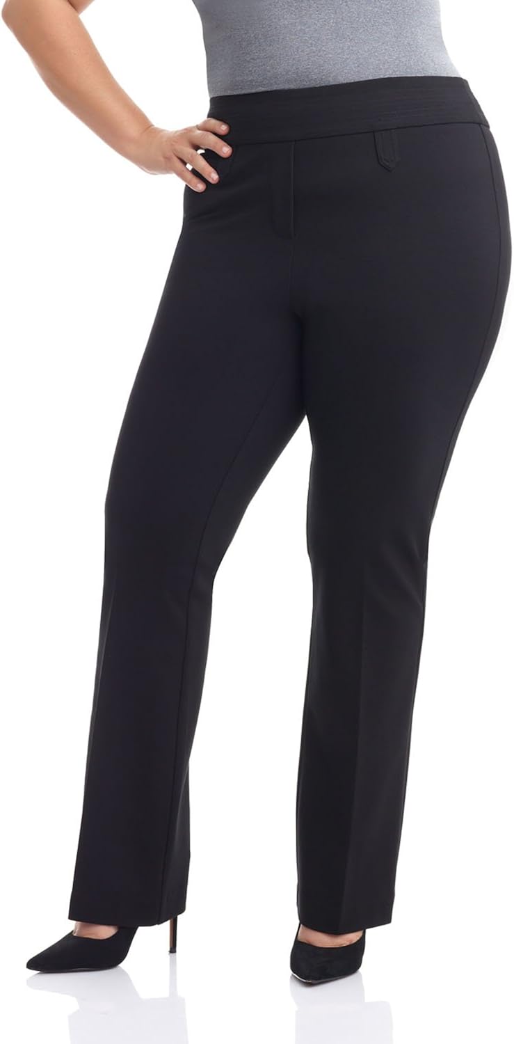 66% Rayon, 29% Nylon, 5% Spandex Pull On closure Machine Wash Introducing Curvy Woman by Rekucci - in sizes 14W - 24W. Available in 3 lengths: Inseam Regular = 32" / Petite = 29" / Tall = 35". Model is 5'10 wearing size 14W. SECRET FIGURE : *NEW* "Secret Figure" fit flatters your body in all the right places! Bootcut shape lengthens your legs. Look and feel slim and chic. Secret figure is your secret weapon! OFFICE YOGA PANT: Feels like a yoga pant but looks totally chic, polished and professional! Mid-rise, straight leg style is fitted from waist to knee, with a slight flare from the knee down. BEYOND COMFORT : Pull-On styling and hidden front tummy control panel. Smooth contour waistband with decorative stitching and faux belt loop details. LUXURIOUS FABRIC: Our compression knit ponte contours and sculpts your curves. Fabric is gutsy, perfect to hide any imperfections! Rayon/Nylon/Spandex blend. Garment made in Cambodia or China.
