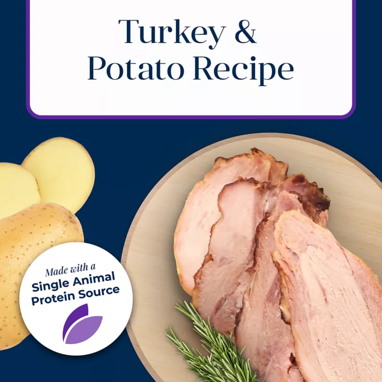 REAL TURKEY FIRST: This Blue Buffalo dry dog food is made with real, high-quality turkey as the #1 ingredientADULT DOG FORMULA: This natural dog food with wholesome grains is formulated with healthy ingredients that support gentle digestion, plus Omega 3 & 6 fatty acids to nourish skin & coatIMMUNE SYSTEM SUPPORT: This dry dog food contains exclusive, antioxidant-rich LifeSource BitsHEALTHY, WHOLESOME INGREDIENTS: This  Blue Buffalo dog food is made with no chicken (or poultry) by-product meals, and no corn, wheat, or soyContains: One (1) 24-lb. bag of BLUE Basics Grain-Free Adult Dry Dog Food, Limited Ingredient Diet, Turkey, 24 lbs. ENHANCED IMAGERY: We have enhanced our digital product packaging to highlight our products' ingredients and essential benefits. While the physical packaging will differ slightly, all information is accurate.