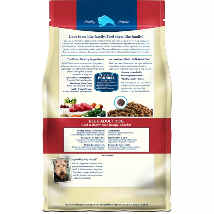 BLUE Life Protection Formula Dog Food is formulated to help your best friend thrive. This dry dog food is made with the finest natural ingredients - including real beef, wholesome whole grains, and healthy fruits and veggies - to support your dog's health and wellness. BLUE Life Protection Formula also features antioxidant-rich LifeSource Bits to support immune system health, life stage requirements, and a healthy oxidative balance. Like all Blue Buffalo dog food recipes, BLUE Life Protection Formula contains no chicken (or poultry) by-product meals. This natural dry dog food is also free of corn, wheat, soy, artificial flavors, and preservatives.