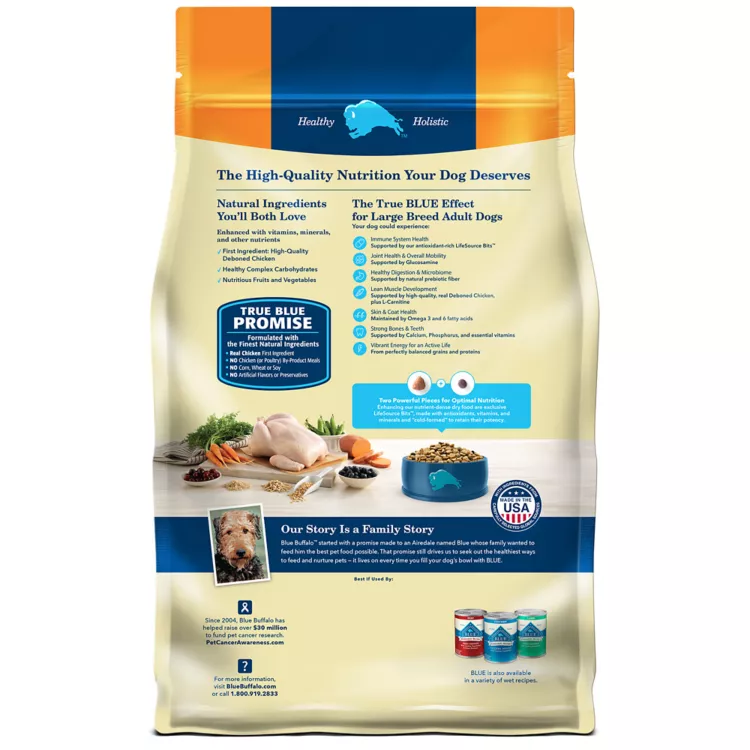 This delicious BLUE Life Protection Formula Adult Large Breed Dog Food, Chicken & Brown Rice Recipe is formulated with real chicken as the #1 ingredient. It's sure to have your pup's tail wagging as soon as you open it. Blue Buffalo large breed dog food is also formulated with fruits, vegetables, and essential nutrients to promote joint health. Like all Blue Buffalo dog food recipes, the Life Protection Formula dry dog food for large breeds is formulated without any chicken (or poultry) by-product meals. This natural dry dog food is also free of corn, wheat, soy, artificial flavors, and preservatives.
