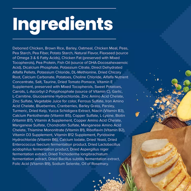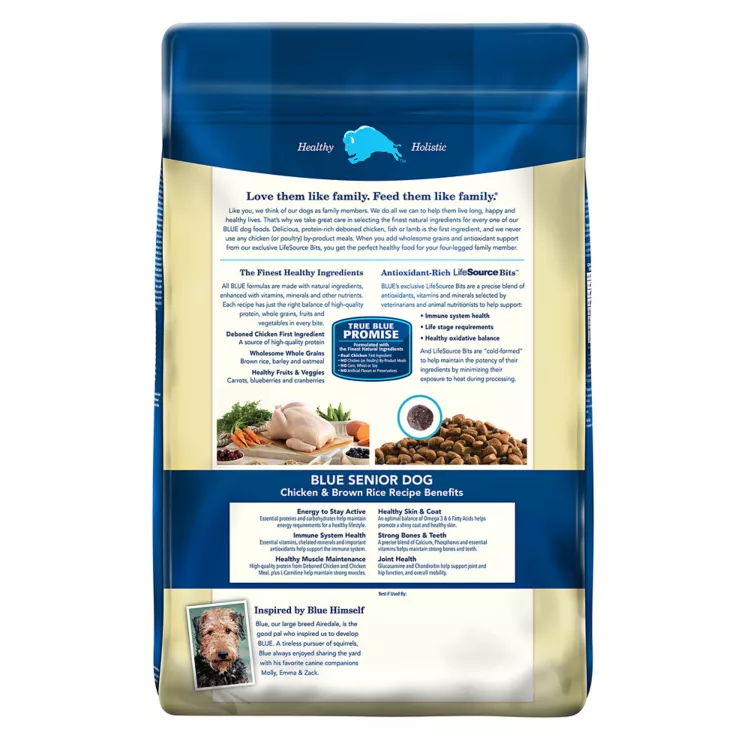 DESCRIPTION BLUE Life Protection Formula Senior Dry Dog Food is made with the finest natural ingredients ââ including real chicken, wholesome whole grains, and healthy fruits and veggies ââ to support your dog's health and wellness. BLUE Life Protection Formula for senior dogs also features antioxidant-rich LifeSource Bits to support immune system health. What's more, this senior dog food contains Glucosamine and Chondroitin to help support hip and joint health for overall mobility. Like all Blue Buffalo dog food recipes, BLUE Life Protection Formula contains no chicken (or poultry) by-product meals. This natural dry dog food is also free of corn, wheat, soy, artificial flavors, and preservatives.