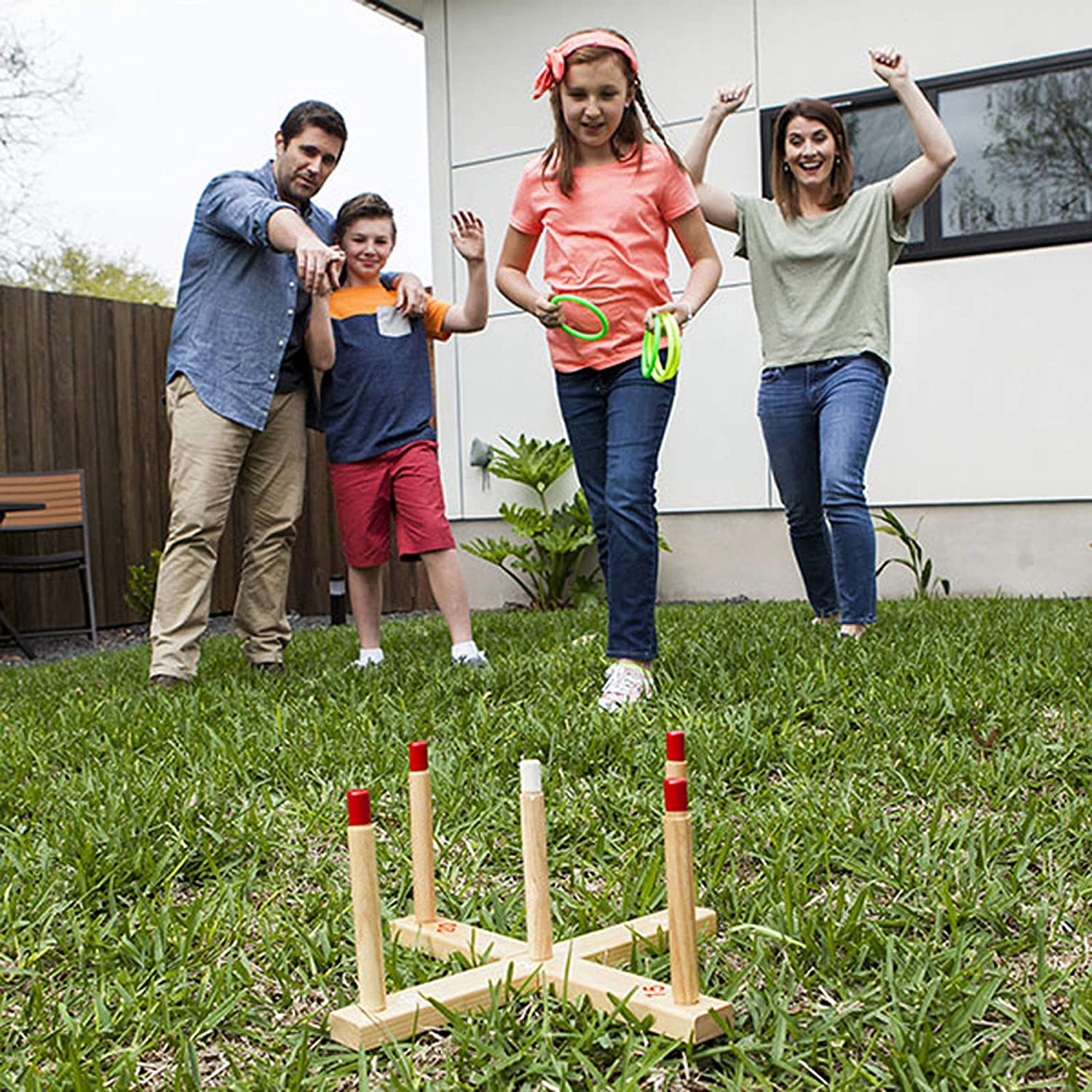 BRIGHT, VIBRANT DESIGN: With durable bright plastic rings with plastic connectors and scoring pegs on the wooden base, this ring toss set is designed for maximum visibility Large numbers on the base also make it easy to keep score and aim