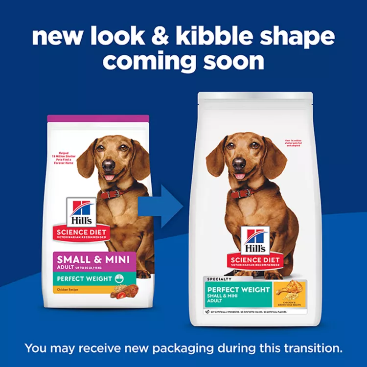 Hill's Science Diet Perfect Weight Small & Mini dry dog food provides delicious, breakthrough weight management nutrition with clinically proven technology for safe and effective weight loss with visible results within 10 weeks, healthy weight maintenance and long lasting weight support, and lean muscle support.