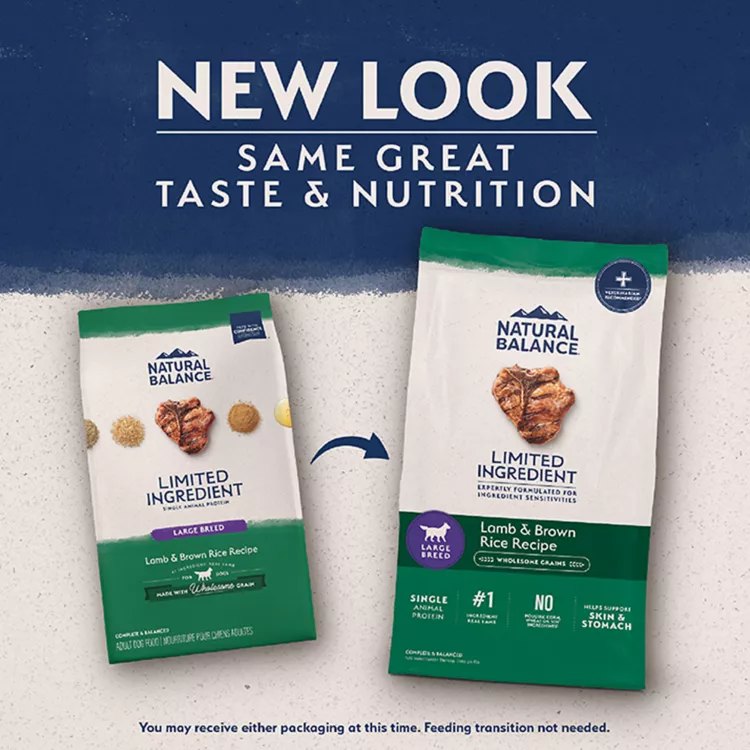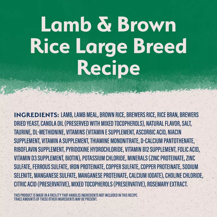 Natural Balance L.I.D. Limited Ingredient Diets Lamb & Brown Rice Large Breed Formula Dry Dog Food is a grain-inclusive premium dog food is made with no gluten ingredients. The first ingredient is real lamb, which provides amino acids to help build the strong muscles your dog needs to make the most of your adventures together. Meanwhile, whole-grain brown rice contains fiber to help support healthy digestion. And with essential vitamins and minerals, this delicious lamb and brown rice formula dog food is complete and balanced to meet the unique nutritional needs of your large breed dog. Designed for large jaws and teeth, this kibble encourages large breed dogs to chew properly and eat slower, while the crunchy texture helps promote clean teeth and healthy gums.