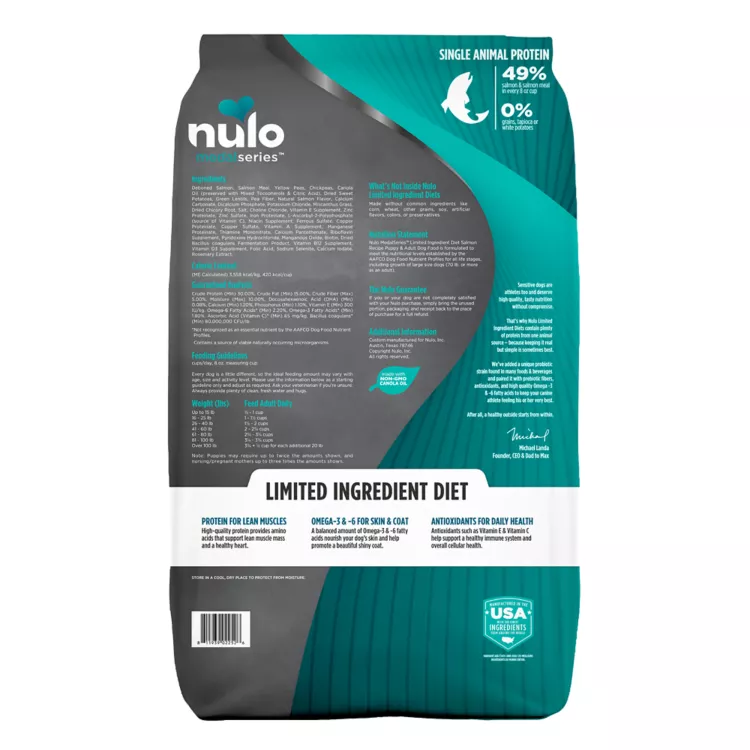 DESCRIPTION Provide your puppy or adult dog with the nutrition he needs to thrive by serving Nulo Medal Series Puppy & Adult Grain Free L.I.D. Salmon Dog Food. This delicious dry blend is specifically formulated for dogs preferring a simplified diet, and offers protein-rich nutrition as well as a host of other essential nutrients that promote overall health.