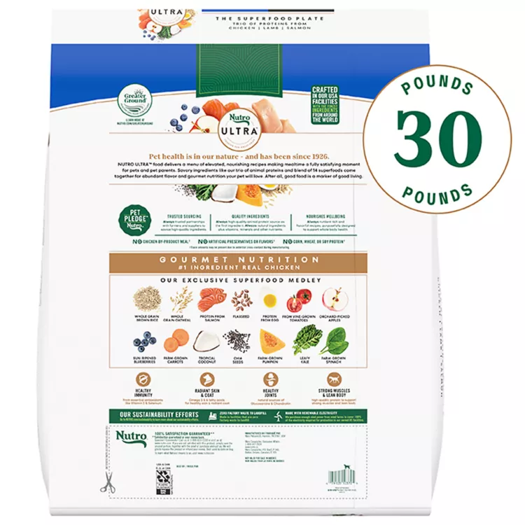 Dogs deserve to enjoy their dry dog food as much as we enjoy our food. That's why Nutro Ultra Adult Large Breed High Protein Dry Dog Food delivers elevated, nourishing recipes to make mealtime an enjoyable experience for both pets and their parents. Crafted with real chicken as the #1 ingredient, your dog is served an appetizing and appealing dry dog food meal. Nutro Ultra Adult Large Breed High Protein Dry Dog Food with a Trio of Proteins from Chicken, Lamb, and Salmon provides essential antioxidants to support the immune system and essential nutrients to support whole-body health. Formulated with high-quality protein to support strong muscles and a lean body, Nutro Dry Dog Food understands that your pet's health and vitality begins with what they eat.
