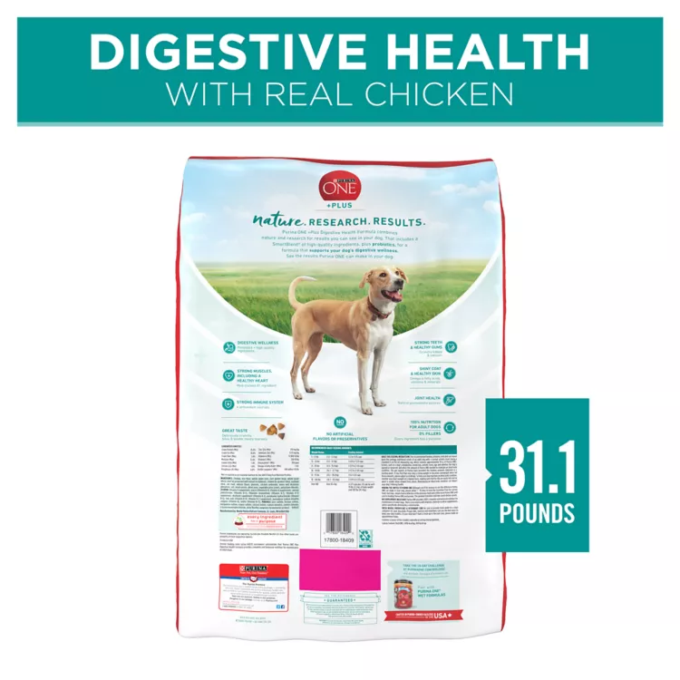 Key Benefits: Complete and balanced digestive care dog food with digestive support for adult dogs with sensitive stomachs, Highly digestible adult dog food formula enriched with probiotics for dog digestive support, Real chicken is the first ingredient in our high protein dog food, which includes natural glucosamine sources for joint health, Real meat Purina ONE dry dog food recipe contains a SmartBlend of purposeful ingredients and no artificial flavors or preservatives and zero fillers, Bagged dog food dry formula crafted in Purina-owned, U.S. facilities by Purina ONE, a veterinarian-recommended brand, Spoil your pet with Purina products. Reward yourself with points on every purchase. Download the myPurina app today