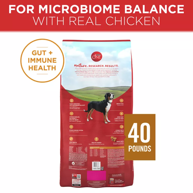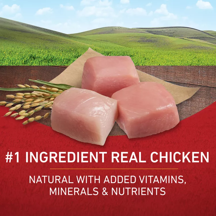 Tempt your dog at mealtime with Purina ONE SmartBlend Natural Chicken and Rice Formula adult dry dog food. Different kibble shapes add enjoyment at mealtime, and real chicken gives him the satisfying taste he craves. Each serving of dog food contains a dual-defense antioxidant blend, including vitamins E and A along with minerals zinc and selenium, to support his strong immune system, and natural sources of glucosamine help support joint health. Omega-6 fatty acids help to support his healthy skin and coat, and the SmartBlend of ingredients helps to deliver complete and balanced nutrition. Serve this dry dog food according to the feeding instructions based on his weight, and make it a delicious part of his daily diet. For even more variety at mealtime, let your faithful friend explore our complete line of Purina ONE SmartBlend wet and dry dog food formulas so he can choose the tastes and textures he loves best.