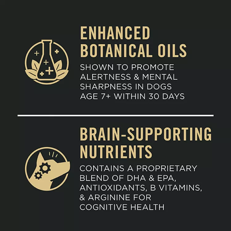 Nourish your dog's mind and help him think more like he did when he was younger with Purina Pro Plan BRIGHT MIND Adult 7+ Chicken and Rice Formula dry dog food. Around age 7, a dog's brain begins to change how it metabolizes glucose, which can affect memory, learning, awareness or decision-making. Purina discovered that enhanced botanical oils can be used to provide an additional fuel source for the brain in dogs age 7+. When added to the daily diet of dogs 7 and older, these enhanced botanical oils promoted memory, attention and trainability. This dry dog food also includes chicken as the first ingredient, which provides your dog with a high-quality source of protein. Glucosamine and EPA, an omega-3 fatty acid, support your dog's joint health and mobility, while omega-6 fatty acids and vitamin A promote healthy skin and a beautiful coat. You can feel good about feeding him a formula designed to deliver top-tier, highly specialized nutrition.